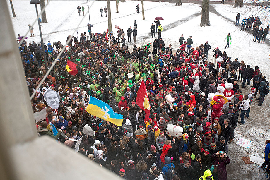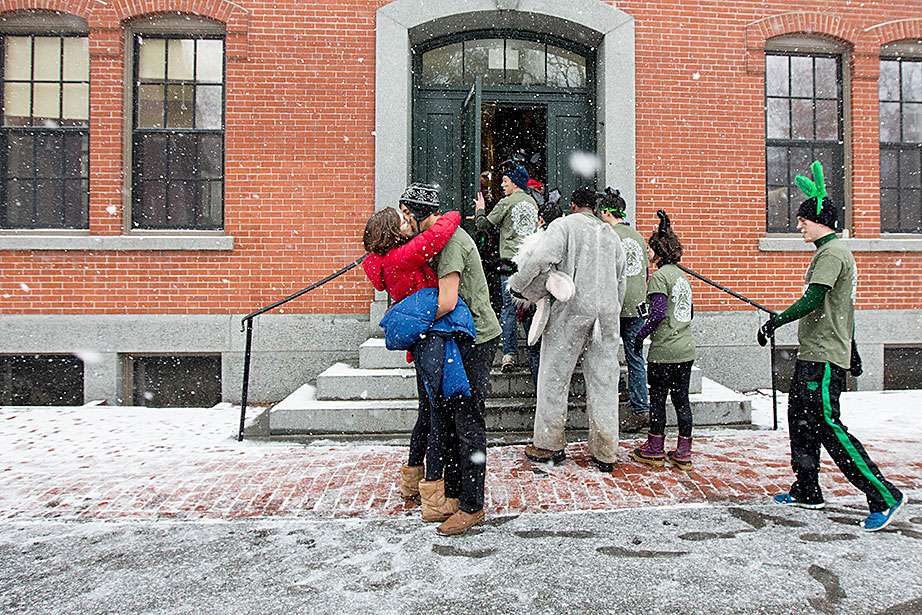 This morning’s cold and snow could not diminish the spirits of hundreds of undergraduates as they raced into the Yard for one of Harvard’s unique and joyous traditions. Sub-freezing temperatures did not deter a few Currier House students from donning their traditional Speedos, or the Adams House undergrads’ usual garb of sport jackets and boxer shorts.
