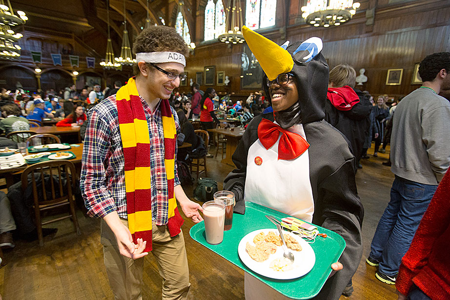 After making their deliveries, representatives from the Houses congregated at Annenberg Hall to greet their new residents as freshmen gathered for lunch. Upperclassmen hugged and high-fived the freshmen as they made their way in to pick up T-shirts, headbands, and bags emblazoned with the colors and shields of their new Houses.