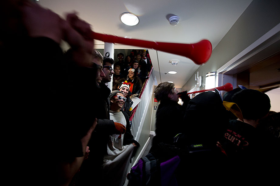 Horns sounded, gongs clanged, and upperclassmen chanted as freshmen watched from their dorm windows. Several students from various Houses paused to take picture with interim College Dean Donald Pfister.
