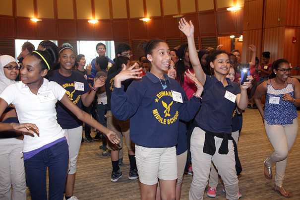 Nearly 400 sixth-, seventh-, and eighth-graders from 15 schools across Boston and Cambridge began a recent morning quite differently than usual. They were at Harvard Medical School (HMS), running in place, doing jumping jacks, and twirling hula hoops. As Beyoncé sang from the speakers, residents from Spaulding Rehabilitation Hospital in Charlestown took to the stage to lead students in a “Get Moving and Get Healthy” warm-up.