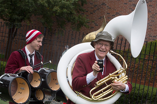 John Smith ’52 (photo1) performed on his sousaphone with the Harvard Band as part of a band reunion during Community Football Day. Brian Vaughan (from left, photo 2) Tyeray Williams, Zyrck Lanier, Ray Williams, Kyle Kelley, and Edner St. Fleur enjoyed the game as Harvard beat Cornell 24-7 (photo 3).