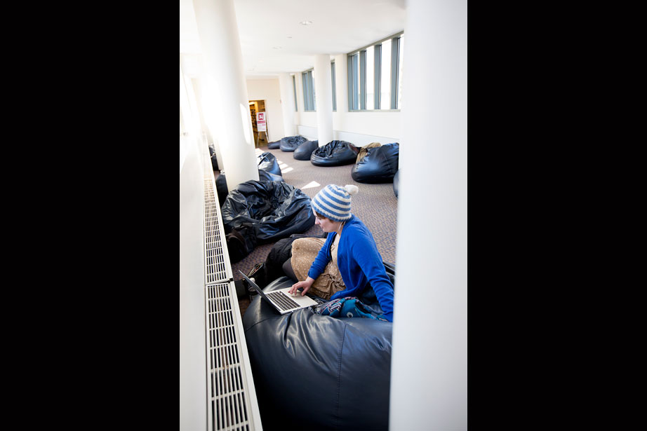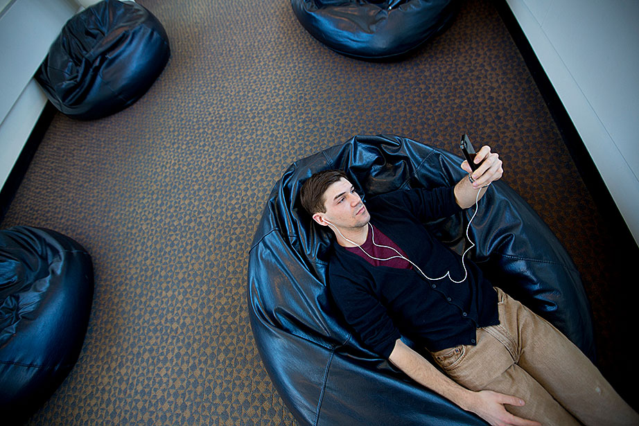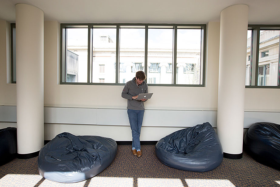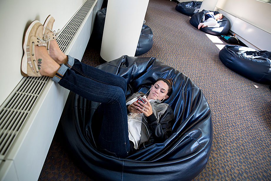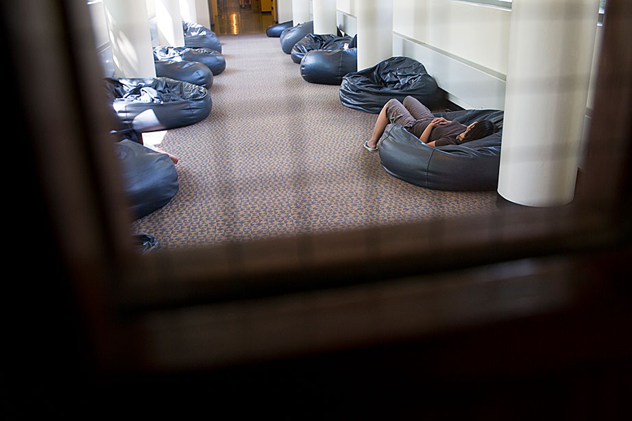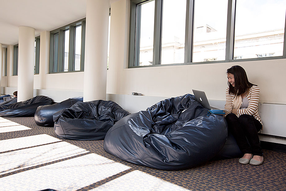 There are many formal spaces in the Langdell Library of Harvard Law School (HLS). But not on the top floor on a bridge leading to the Lewis Hall stacks, where 14 oversized, decidedly informal beanbag chairs line the passage. Referred to by the librarians as “Beanbag Alley,” it’s a place to stretch out, laptop-on-lap, make a phone call, or listen to music on headphones. Students can also be found Skypeing with faraway family members or simply napping, sometimes in catlike positions. It’s a place to reflect and recharge, to daydream about home or future endeavors, and just to be.