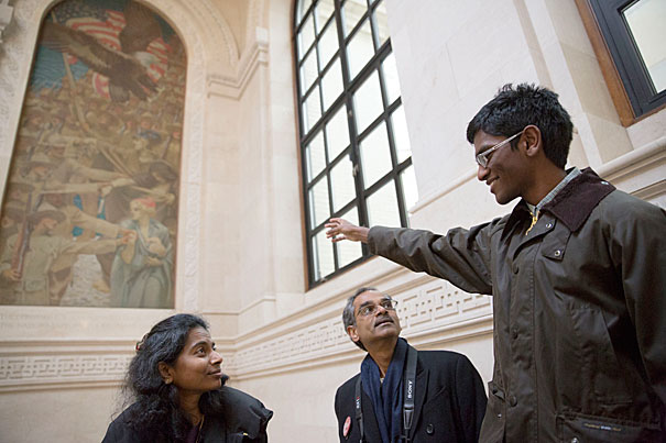 During Freshman Parents Weekend Vikram Sundar ’18 and parents Shankari (left, photo 1) and Jagane Sundar tour Widener Library, while Greg Picard ’18 (left, photo 2) and his parents Suzanne and Matthew Picard from D.C., take a tour of the Yard led by Jake Levin ’16 (right). Chris Ufere ’18 brought his parents to the steps of Widener Library (photo 3).