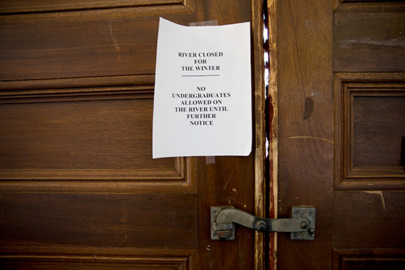 Assistant coach Patrick Lapage has been leading the anti-ice efforts, which are equal parts MacGyver and winging it. Lapage ’12, a onetime government concentrator, takes a boat out with a companion, and whoever isn’t driving stands at the rear of the boat, rocking side to side to break up the ice. Creating waves helps crack it as well, he noted, as does smashing it with an oar.