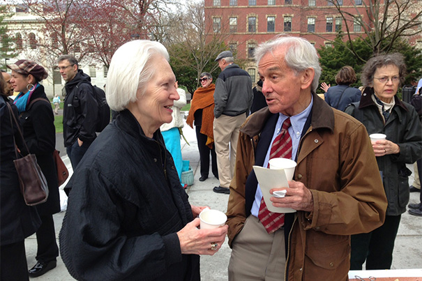 Suzanne Hamner and Bill Crout during a Wednesday coffee-hour gathering outside the Memorial Church (date unknown). A service of remembrance will be held for Crout at the Memorial Church on Friday at 10 a.m.
