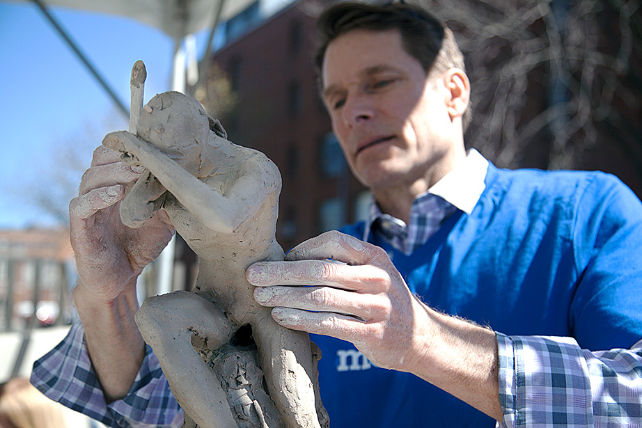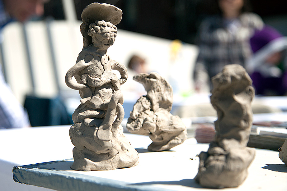 Regardless of how they arrived, they found themselves welcomed, even encouraged to participate. Coordinators sported “Make Art” shirts, as if to focus attention not on specific performances or pieces but on the general creative environment. White tents on the plaza featured stations such as “Living Sculpture” and “Scan, Touch, Play” that put casual viewers in the role of artists. At “Wheel Throwing,” younger kids tried their hands at clay pottery. “It’s hard, it takes practice,” said a reassuring instructor as parents looked at their children’s work with fascination.