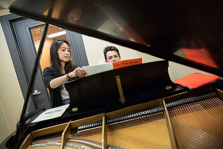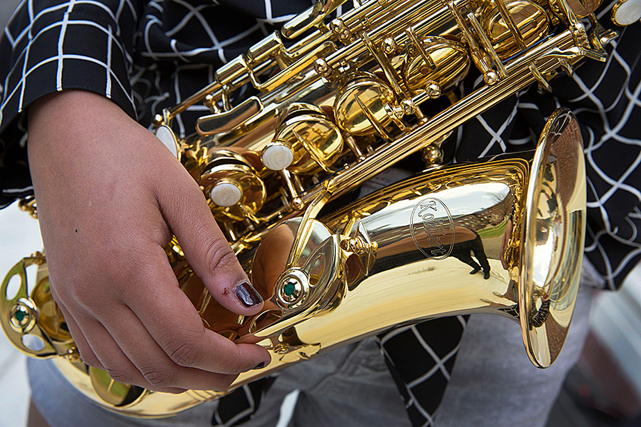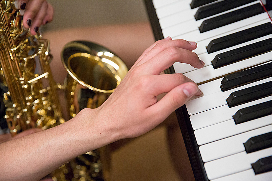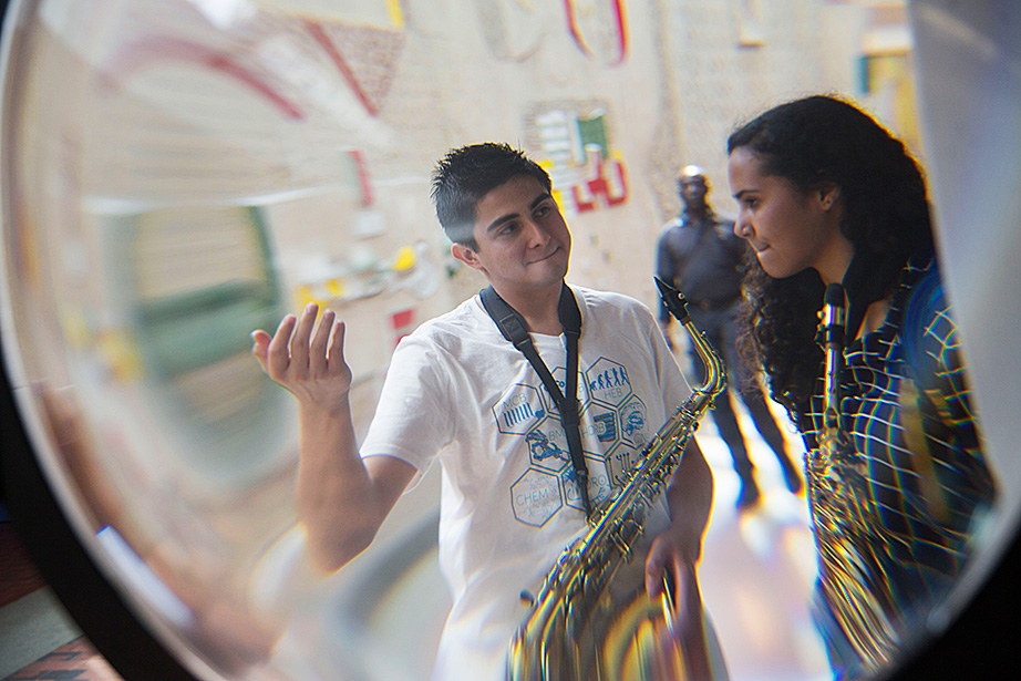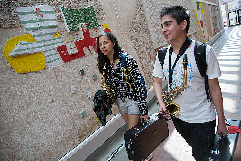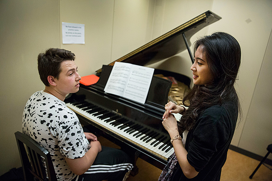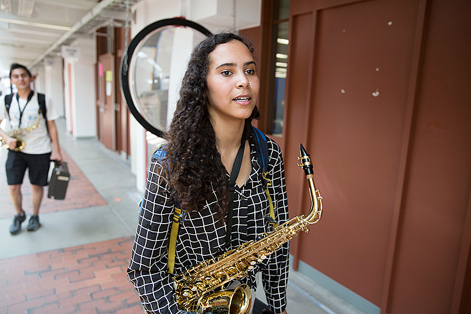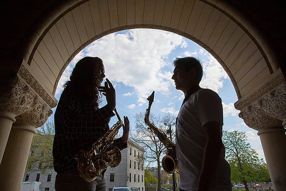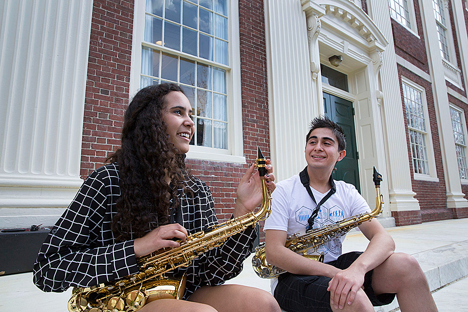 Walking through a labyrinth of orange hallways to a practice room in Paine Hall, saxophonist Mariah Goldsmith, a ninth-grader at Cambridge Rindge and Latin School, fine-tunes the details of her upcoming performance at Ryles Jazz Club in Cambridge with David Armenta ’17, a volunteer with Harvard and Radcliffe Musical Outreach to Neighborhood Youth (HARMONY), which provides instrumental and vocal instruction for children in the Cambridge Public Schools.