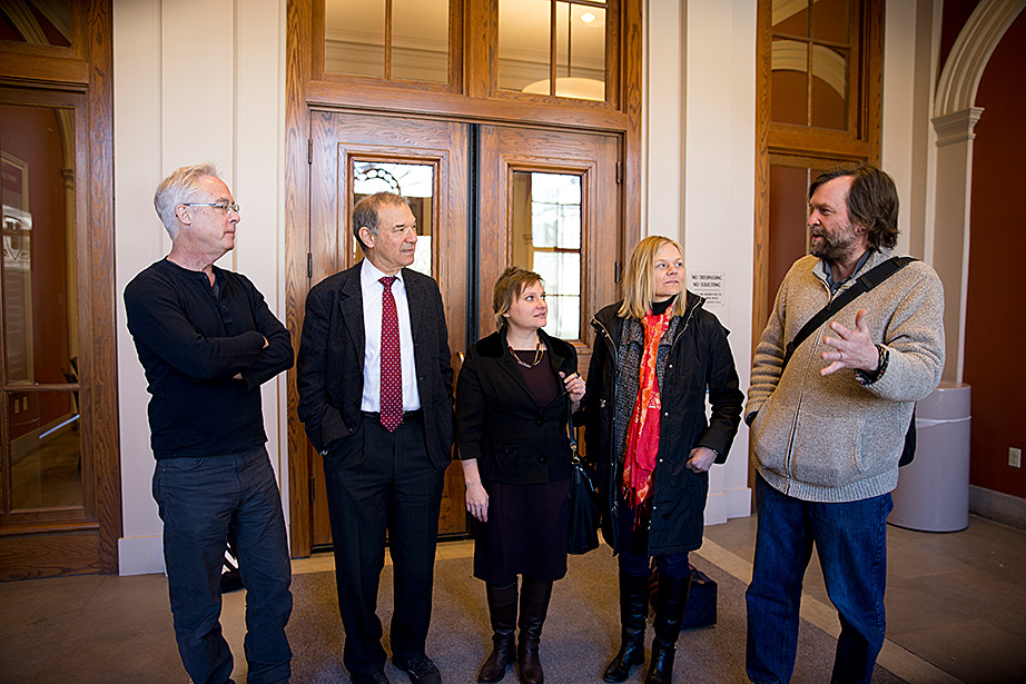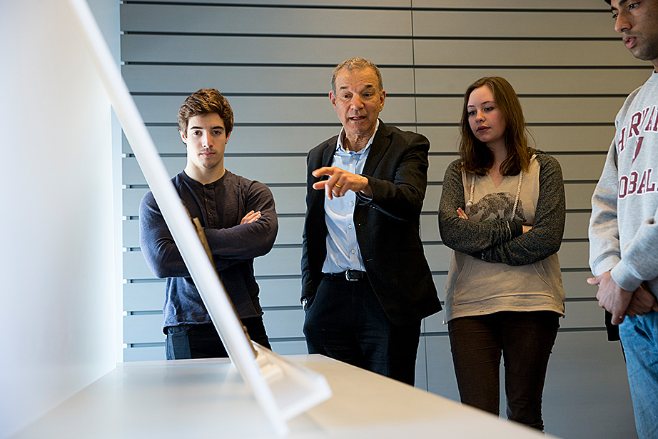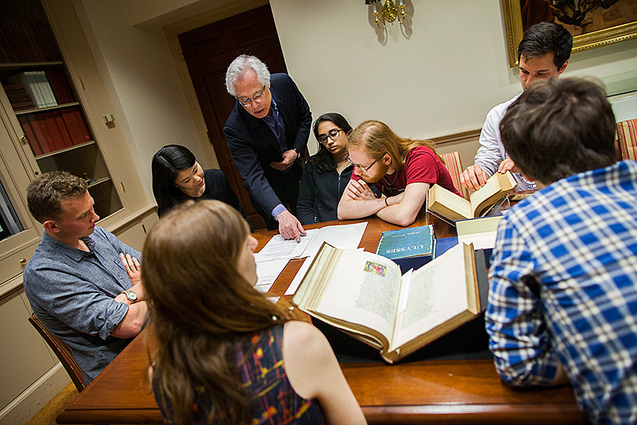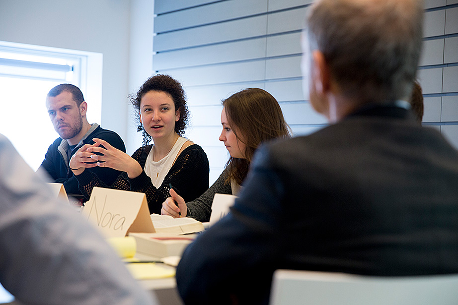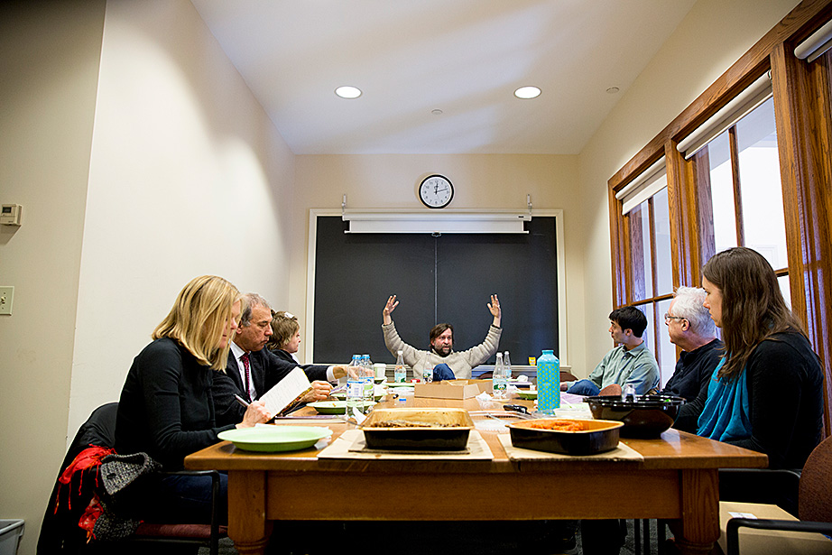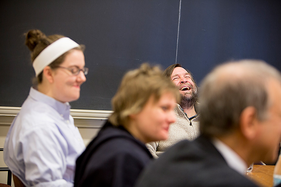 Professors Louis Menand (from left), Stephen Greenblatt, Katharina Piechocki, Emma Dench, and Ned Hall meet each Monday over lunch to discuss the upcoming weekly lecture for their class, “The Humanities Colloquium: Essential Works 2.” Stephen Greenblatt and Louis Menand lead students to the seminar room of Houghton Library to see some of the treasures from the collections. Charlie Gibson ’18 (from left), Jane Chung ’15, Menand, India Patel ’18, Mitchell Edwards ’18, and Archie Stonehill ’17 examine a typescript of an unpublished play by Samuel Beckett from the 1950s. Stephanie Mitchell/Harvard Staff Photographer A fragment of one leaf of the first known copy of Homer’s Iliad, from circa 1050-225 B.C. Stephanie Mitchell/Harvard Staff Photographer In addition to sections and lectures, students sign up to attend plays and operas. This group recently visited the Isabella Stewart Gardner Museum in Boston. In the courtyard, museum tour guide Katherine Fein (left) talks to students including India Patel ’18 and Sohyun Yoon ’18. At the museum, students saw works by Rembrandt and Sargent. The first stop was the iconic courtyard. Lauren Kopajtic (second from right), a doctoral candidate and head teaching fellow for Humanities 10b, brought the group to and from the museum by subway. Aaron Suduiko ’17, Claire Benoit ’17, and Nora Sagal ’18 discuss Dostoyevsky inside Greenblatt’s museum classroom. Matt Ricotta ’15 (left) and Nora Sagal ’18 listen as Stephen Greenblatt talks about art. Students get a close-up look at “Birth of John the Baptist” 1475-1500, and “Madonna and Child Holding Dove,” late 16th century, by unidentified artists. On Mondays, the team meets over lunch. Professor Ned Hall (right) animatedly talks about his lecture topic, David Hume’s “Dialogues Concerning Natural Religion.” Teaching fellow Helen Cushman is on the left. As presenter of the upcoming lecture, Ned Hall sits at the head of the table.
