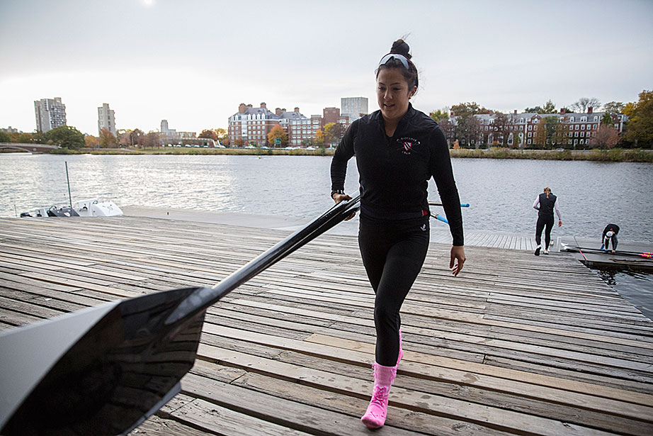 As Marina Felix ’19 read through coursework while training on the spinning machine, she described the high level of athleticism, and fellowship, in Weld Boathouse.