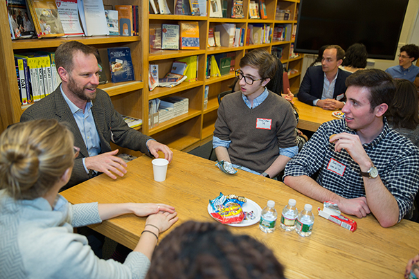 Elmer who teaches Greek literature, joined Alex Rehding, Fanny Peabody Professor of Music, and Stephen Osadetz from the English Department on a recent Wednesday evening to headline the latest student-faculty dinner. Hosted by the Division of Arts and Humanities and the Office of Career Services, the dinners are the part of an effort (along with the Arts Café in Barker) to build community in the division. They’ve become popular affairs, drawing more than 550 students to dine with nearly 80 professors since launching three years ago.