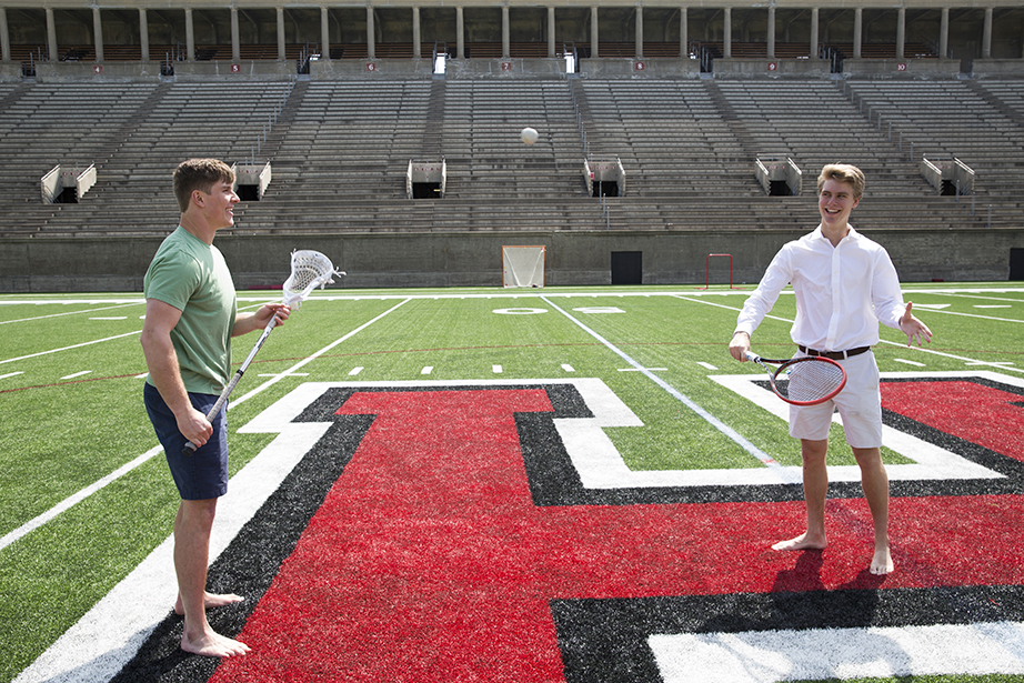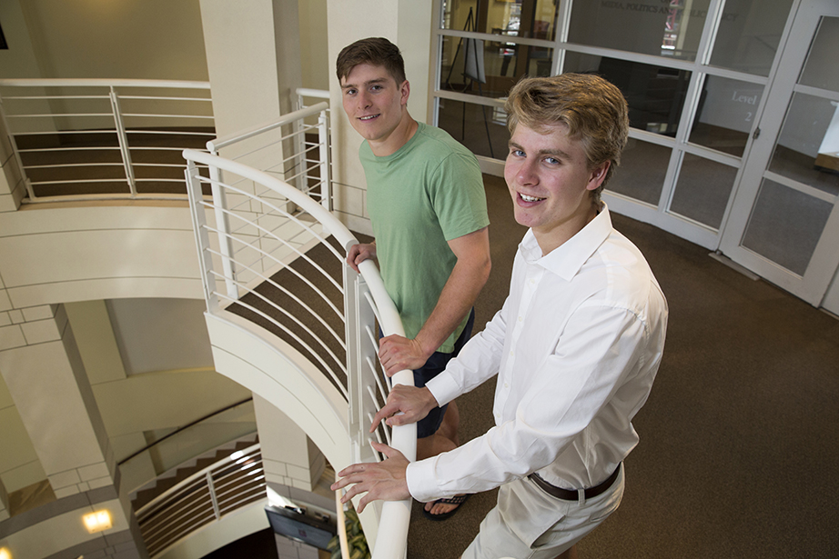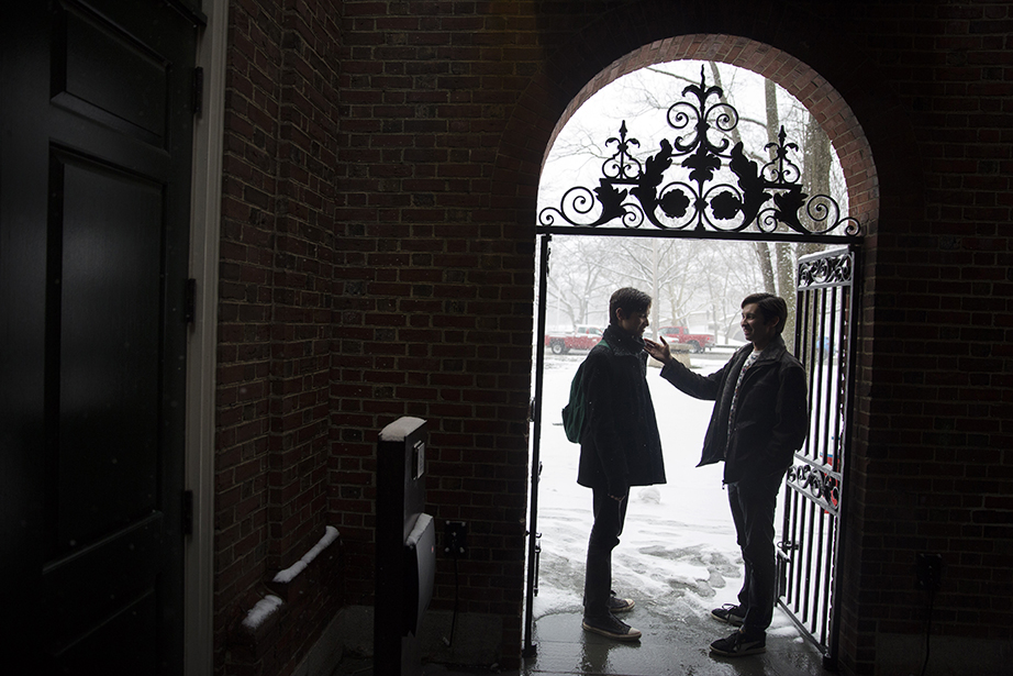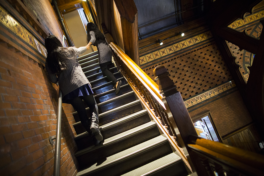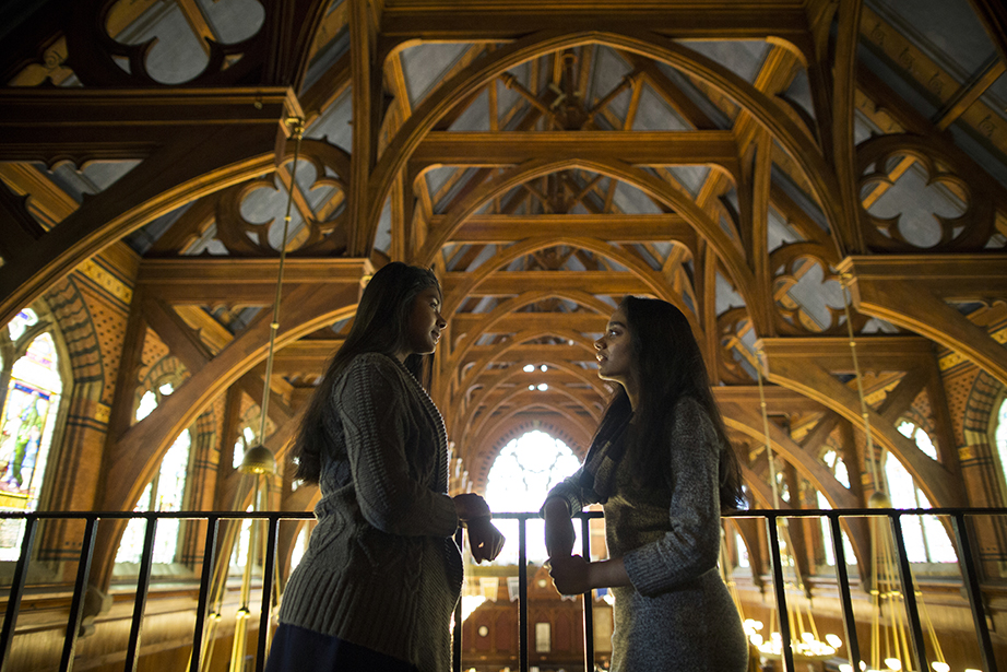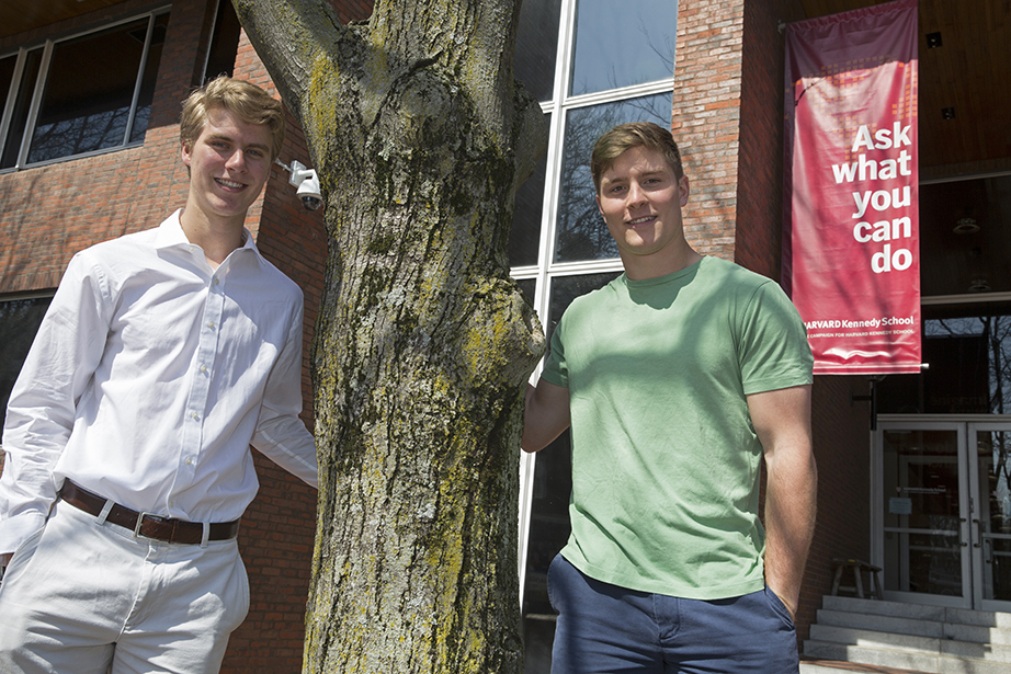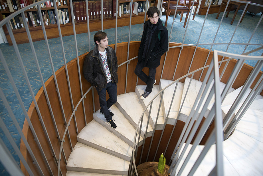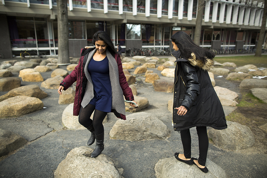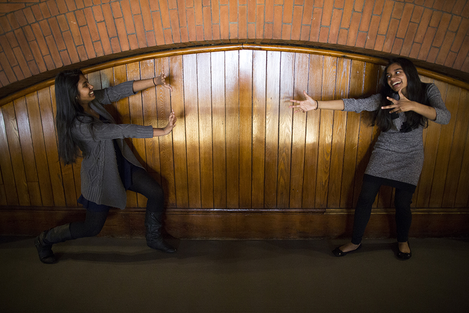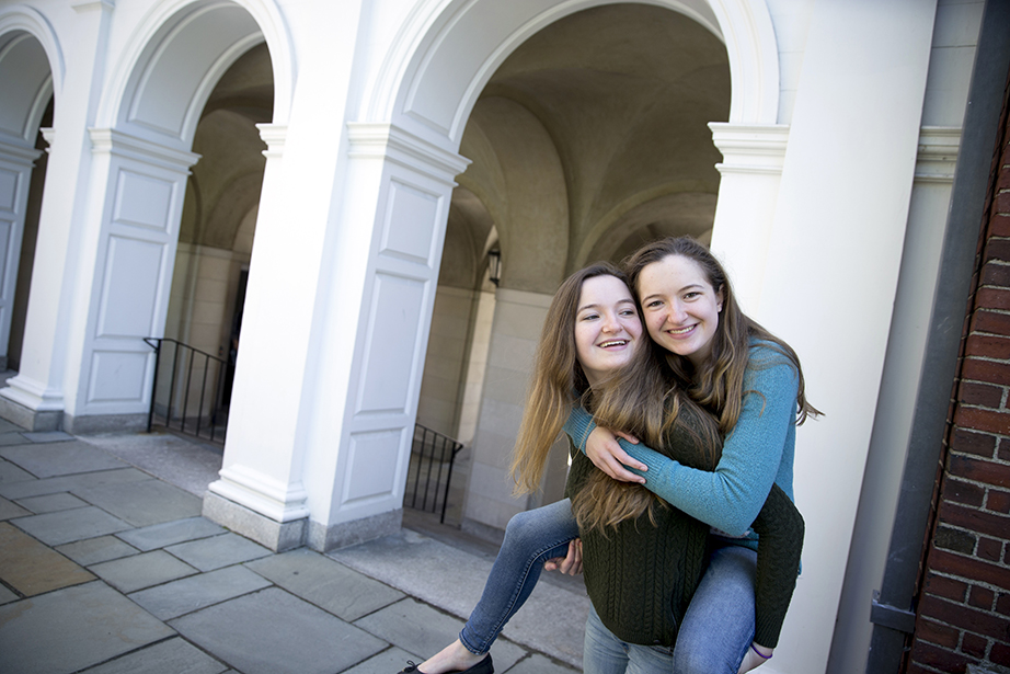 Freshmen Anna (left) and Anne Raheem ’19 arrived at Harvard from Tennessee delighted to experience their undergraduate years together. The fraternal twin sisters find it reassuring to know they have each other. “If I was missing home, I would have a piece of home with me here,” Anna says. Stephanie Mitchell/Harvard Staff Photographer The Raheem twins stay connected through their academic interests and extracurricular activities. Both plan to concentrate in bioengineering with a possible secondary concentration in government, international relations, or a language program. They are both active in the South Asian Association, Ghungroo, Harvard Political Review, Harvard College Engineering Society, Harvard Women in Computer Science, Harvard Islamic Society, and Harvard Caribbean Club. Stephanie Mitchell/Harvard Staff Photographer “When you’re together and you’re twins, a lot of people perceive you to be the same person,” says Anne Raheem. “Our parents encouraged us to be our own unique individuals.” Stephanie Mitchell/Harvard Staff Photographer Since their arrival on campus, the Raheem sisters’ relationship has evolved. “We were put into this whole new world. It is an entirely new way of living … everything about this place is completely revolutionary,” says Anne. Stephanie Mitchell/Harvard Staff Photographer As Anne and Anna Raheem look beyond their years at Harvard, “Who knows where we’ll be in three years?” Anna says. “No matter where we end up, we’ll have each other’s back.” Stephanie Mitchell/Harvard Staff Photographer Identical twins Alex (left) and Eli Lee ’17 watch April snow flurries from a Leverett House gateway. Kris Snibbe/Harvard Staff Photographer “Joining the [WHRB] Record Hospital eased my greatest concern about Harvard: that people here wouldn’t be weird enough,” says Eli Lee. “If you’d told me three years ago that in college I would be able to study Central Asian languages during the day and debate hardcore scene politics at night, I wouldn’t have believed you.” Kris Snibbe/Harvard Staff Photographer Eli (left) and Alex Lee ’17 admire a giant mixed-media work by classmate My Ngoc To ’16 in the Carpenter Center. Alex has studied drawing and film as part of his undergraduate concentration. Kris Snibbe/Harvard Staff Photographer “My brother and I have always been very different, but the more insular environment and limited opportunities of our hometown prevented us from exploring our different pastimes and interests,” says Alex Lee. “At Harvard, I’ve been able to involve myself in the performing arts community while maintaining a strong friendship with Eli. Even though our interests are very different, we do our best to support each other — Eli comes to my improv shows, and I go to events at the Advocate and tune into his radio show!” Kris Snibbe/Harvard Staff Photographer “I didn’t set out to go to the same school as my brother, but I don’t regret it,” says Alex Lee. “We don’t have to see each other all the time — and we don’t, really — but it’s good to know there’s someone here who will always have my back. No one understands you like your twin, after all.” Kris Snibbe/Harvard Staff Photographer Identical twins Alannah (left) and Grace O’Brien are in their first year at Harvard. Alannah writes, “I get mixed up with my sister almost too many times to count. For example, one day in Annenberg Hall, a guy I didn’t know came up and said hi to me. It soon became clear that he thought I was Grace. When I told him I was Grace’s twin, he thought I was pranking him, and it took some convincing.” Rose Lincoln/Harvard Staff Photographer The O’Brien twins hail from nearby Brighton, Mass., and will live in separate undergraduate Houses next year. Grace says, “I think being a twin has made my experience at Harvard both easier and harder. We are very close, so it’s nice to have someone around who will always be there for me. However, throughout high school and elementary school, we were treated almost like the same person, which was frustrating. So we decided to lead completely different lives at Harvard.” Rose Lincoln/Harvard Staff Photographer For concentrations, both O’Brien girls are undecided, but Grace is leaning toward government. “We participate in different extracurricular activities, hang out with different people, and we don’t plan on choosing the same concentration,” Grace says. “This allows us to lead separate lives, while staying close.” Rose Lincoln/Harvard Staff Photographer Grace O’Brien says, “Obviously my sister and I are not telepathic, but we know each other so well that generally it’s easy to tell what the other is thinking.” Rose Lincoln/Harvard Staff Photographer Alannah O’Brien will live at Lowell House next year, while Grace chose Quincy House. Rose Lincoln/Harvard Staff Photographer Harvard sophomores Nicholas (left) and Beau Bayh ’18 are twins from Indiana. Both have an interest in politics and social service, as well as athletics. They stand at the entrance to the Harvard Kennedy School in front of a sign that reflects their desire to serve: “Ask what you can do.” Jon Chase/Harvard Staff Photographer Beau (left) and Nicholas Bayh ’18 stand in the Taubman Center at Harvard Kennedy School. Their interest in public service stems from a family legacy: Their grandfather Birch Bayh and father, Evan Bayh, have both served as their state’s governor and U.S. senator. Jon Chase/Harvard Staff Photographer Beau (left) and Nicholas Bayh ’18 juggle balls with sticks from their respective sports. Beau is on the lacrosse team, while Nick plays for a competitive club tennis team at Harvard. Jon Chase/Harvard Staff Photographer Harvard sophomores Beau (left) and Nicholas Bayh toss a ball on the turf at Harvard Stadium. Jon Chase/Harvard Staff Photographer Twin sophomores Nicholas (left) and Beau Bayh ’18 stand in Harvard Stadium, h