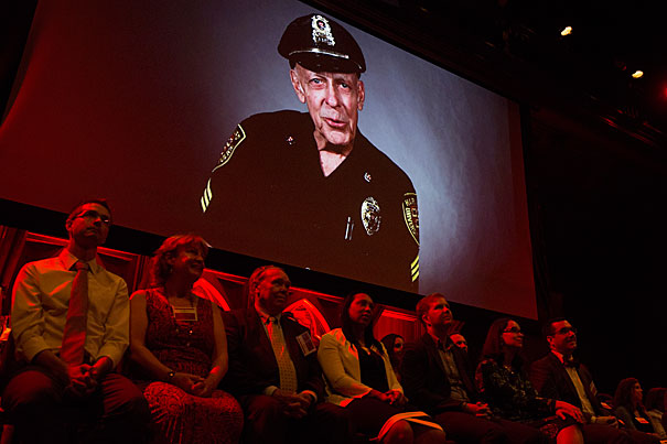 The image of Sergeant Dan Twomey appears above his fellow Harvard Heroes. Sixty-three University staff members were honored for their contributions to Harvard during a ceremony at Sanders Theatre.