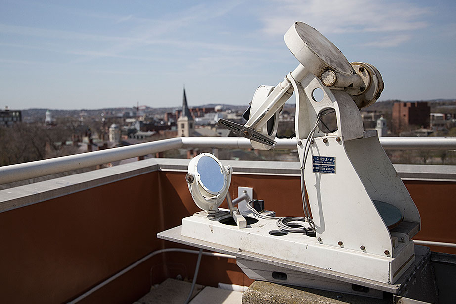 A glimpse inside the Loomis-Michael Observatory in the Science Center, which is managed by students and open to all of Harvard’s friends and affiliates. Friends Samuel Meyer ’13 and Cameron French, an MIT graduate, visit the observatory often to look at the moon and Jupiter. Part of the Astronomy Lab’s mini solar observatory, the rooftop heliostat is used by many students to make daytime observations of the sun by aligning the mirrors with it. A student takes part in a daytime observation of the sun at the Astronomy Lab by looking through the spectrograph. When the light from the heliostat is directed into the slit of the spectrograph, the student can see the sun’s spectrum. During a daytime sun observation at the Astronomy Lab, students search for sunspots when light from the heliostat is directed onto the table. The Astronomy Lab is primarily used for undergraduate astronomy and Earth and planetary science courses. At the Loomis-Michael Observatory on the 10th floor of the Science Center, the student-run Student Astronomers at Harvard-Radcliffe (STAHR) organization gives Harvard students and affiliates a chance to learn more about astronomy and enjoy looking at the night sky. A chair bears the Greek name of the constellation Cassiopeia. The chair has been in the lab for as long as staff members can remember. A dalek robot, a wooden artist’s mannequin, and a “Star Wars” toy are at home in the Loomis-Michael Observatory. Nine-year-old Livis Gonzalez looks at Jupiter through the Loomis-Michael telescope while visiting Harvard with her parents. Michael Goldberg, 7, visits the Astronomy Lab with his relative Yossi Mandel from Los Angeles. “My elder brother will be going to Harvard next year and we’re here to look around the campus,” said Michael while excitedly looking at the telescopes and other equipment. Michael Goldberg peers through the Loomis-Michael Telescope while Allyson Bieryla, manager of the Astronomy Lab and the Clay Telescope, helps him understand how it works. Livis Gonzalez makes the most of the Loomis-Michael Telescope. Lab manager Allyson Bieryla observes the night sky through the Clay Telescope on the roof of the Science Center. The Harvard Observatory Project (HOP) uses the telescope to get undergraduate students interested in astronomy and give graduate students a chance to interact with undergrads.