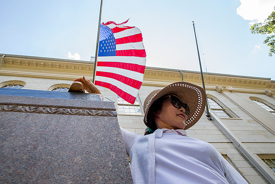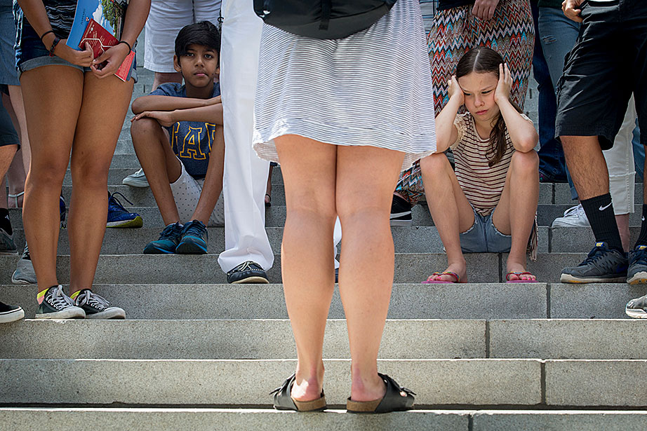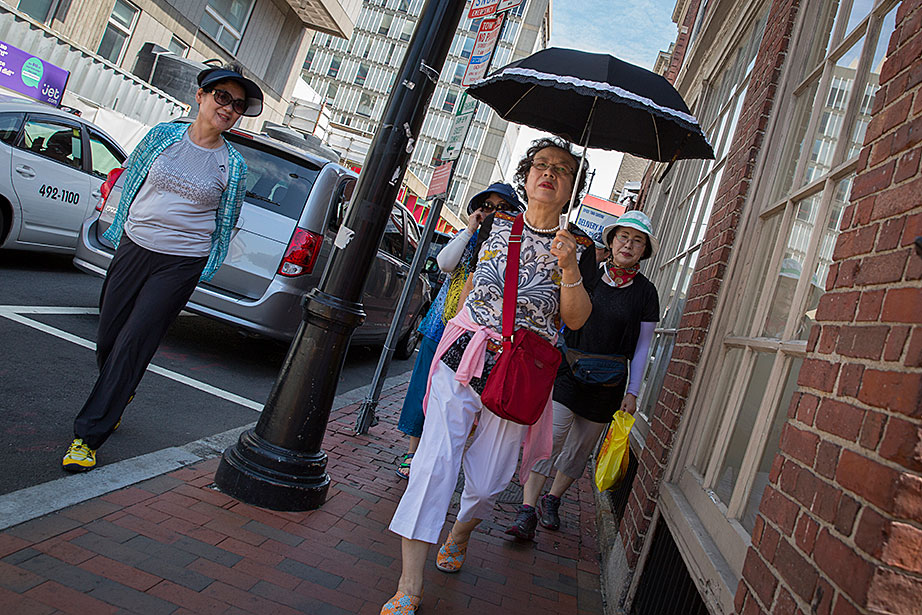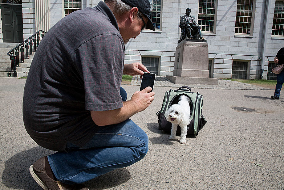 Among the postcards at Crimson Corner (formerly Nini’s Corner) on Massachusetts Avenue in the heart of Harvard Square is one of an orangutan that reads, “What! You Haven’t Been to Harvard?” Native Floridians take a double-decker bus around Harvard and MIT. Tourists from South Korea stay shaded on Holyoke Street. Enrico Benitez, 13, of California, waited in Harvard Square for his campus tour. What did he think the campus would be like? “I’m expecting it to be grand and marble,” Benitez said. The John Harvard Statue is the place to be. Tours are not always exciting for everyone. Mike Rorro and his dog, Charlie, came from California to live in Cambridge this month. These Chinese tourists bought lots of swag in New York City on their way to Boston. A group meets on the steps of University Hall. Dealing Moon of South Korea, visiting with his wife, Seonyoung, had trouble finishing his first hamburger — a triple decker at Bartley’s on Mass. Ave., and needed a fork and knife. One last photo!