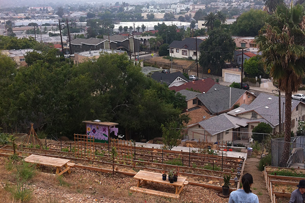 That’s how I found myself staring up at a quarter-acre of terraced hillside tucked next to a basketball court, a wavering line of stairs climbing toward a priceless view of downtown L.A. I had worked on a full-scale organic farm before, but I realized I knew nothing about what I was getting into. The farm was revitalized a year ago when Britt Browne, a local artist and grower, came on as manager. She began an after-school farm program and had the hillside terraced, increasing its production capacity.