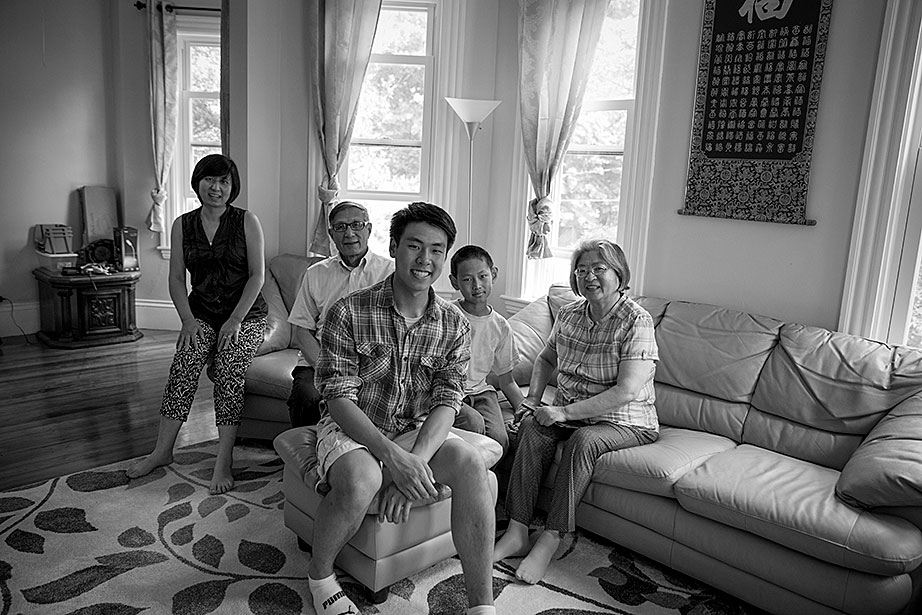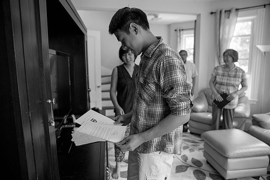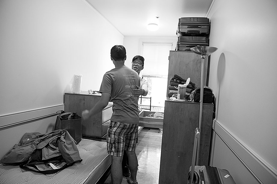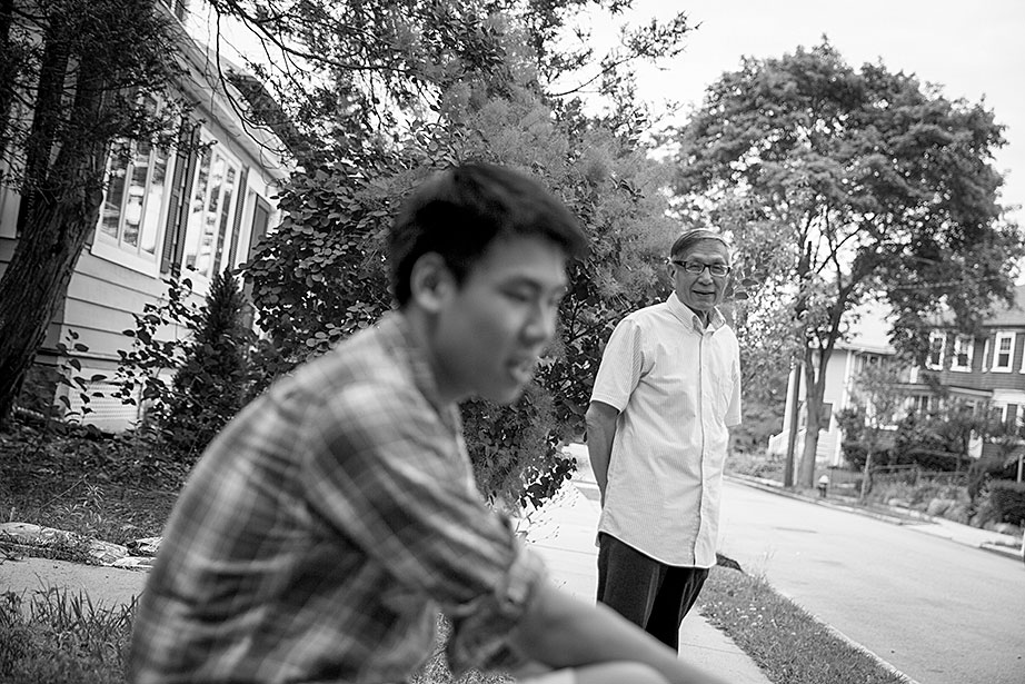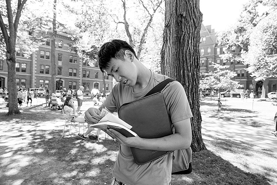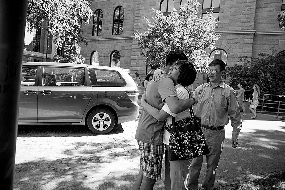 Incoming freshman, Kevin Yang, foreground, and his family, at their home. From left, Yi Jin, Kevin’s mother; grandfather, Yongshou Jin; brother, Neil Jin and grandmother, Yi Qun Zhu. His dad, Hailin Yang, not pictured, was at work. A shelf in the living room displays Kevin’s many awards and some family photos. Kevin reads his acceptance letter to Harvard. Kevin’s younger brother, Neil, looks up to him. Neil takes Kevin’s longboard for a ride in their neighborhood. Kevin’s grandfather, Yongshou Jin, speaks Shanghainese. Kevin speaks English, Latin, Chinese, Spanish, and Shanghainese. For several years, Kevin’s grandparents drove him to and from the Ed Portal, school, and other activities. Currently, Kevin is in the driver’s seat with his learner’s permit while his grandfather instructs him from the passenger seat. Kevin attended Boston Latin School, the oldest school in America, founded in 1635. Five signers of the Declaration of Independence along with many other notable historic figures attended BLS. Kevin graduated in June. Kevin and Neil pose inside the Harvard EdPortal. When Kevin attended, the Ed Portal was across the street from its current location at 224 Western Ave. in Allston. Membership is free and hundreds of students like Yang take advantage of the Allston-Brighton mentoring program, which pairs a Harvard student with a local youth. Neil plays a computer game, while Kevin looks on. Remembering his own mentor, Kevin says, “He was more than a tutor — he was a real person, he helped me to chill. He recognized my human side … he also saw my interest in biology and helped me with my studies.” On freshmen move-in day, Kevin, returning from his Freshman Orientation Program (FOP), greets Catherine Zhang ’19, on left, while his mother, Yi Jin and father Hailin, look on. Yi Jin rejoiced when she saw her son following his FOP of hiking and camping in the White Mountains of New Hampshire. Kevin greets his new roommate, T.J. Song (right) of Gilroy, Calif. They’ll share a room, part of a suite in Weld Hall. In Harvard Yard, Kevin checks his new Harvard ID, comparing it to the one from Boston Latin, and noting how much he has changed. Kevin hugs his mother. His father, Hailin, said he would miss work to be at move-in day partly so he could, “park the car in Harvard Yard.” The family car is to the left.