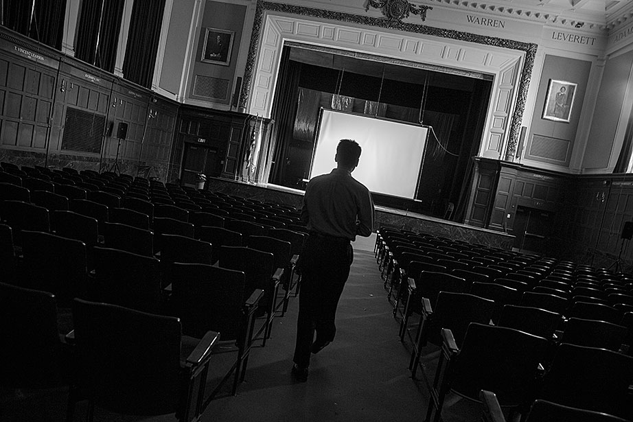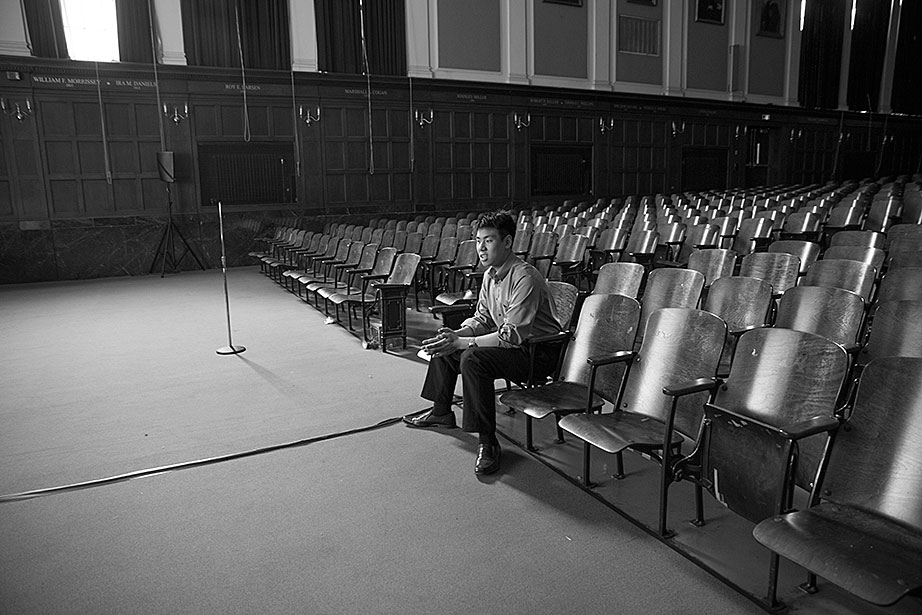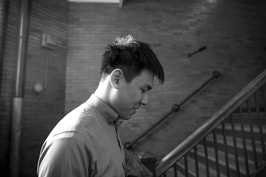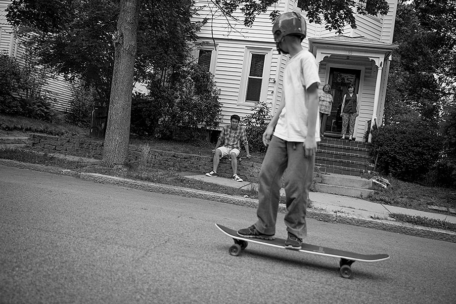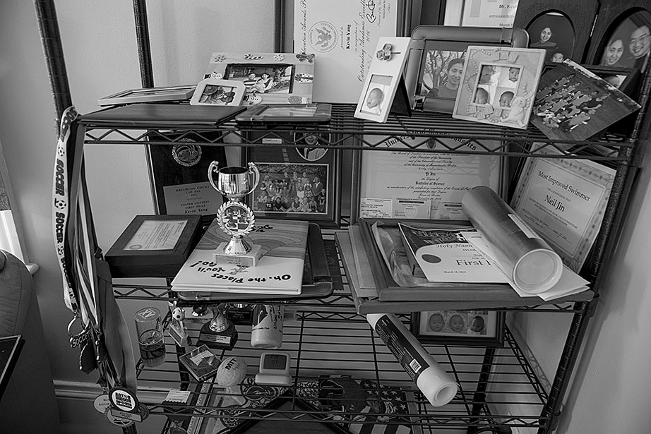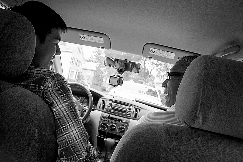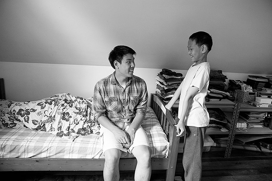Incoming freshman, Kevin Yang, foreground, and his family, at their home. From left, Yi Jin, Kevin’s mother; grandfather, Yongshou Jin; brother, Neil Jin and grandmother, Yi Qun Zhu. His dad, Hailin Yang, not pictured, was at work. A shelf in the living room displays Kevin’s many awards and some family photos. Kevin reads his acceptance letter to Harvard. Kevin’s younger brother, Neil, looks up to him. Neil takes Kevin’s longboard for a ride in their neighborhood. Kevin’s grandfather, Yongshou Jin, speaks Shanghainese. Kevin speaks English, Latin, Chinese, Spanish, and Shanghainese. For several years, Kevin’s grandparents drove him to and from the Ed Portal, school, and other activities. Currently, Kevin is in the driver’s seat with his learner’s permit while his grandfather instructs him from the passenger seat. Kevin attended Boston Latin School, the oldest school in America, founded in 1635. Five signers of the Declaration of Independence along with many other notable historic figures attended BLS. Kevin graduated in June. Kevin and Neil pose inside the Harvard EdPortal. When Kevin attended, the Ed Portal was across the street from its current location at 224 Western Ave. in Allston. Membership is free and hundreds of students like Yang take advantage of the Allston-Brighton mentoring program, which pairs a Harvard student with a local youth. Neil plays a computer game, while Kevin looks on. Remembering his own mentor, Kevin says, “He was more than a tutor — he was a real person, he helped me to chill. He recognized my human side … he also saw my interest in biology and helped me with my studies.” On freshmen move-in day, Kevin, returning from his Freshman Orientation Program (FOP), greets Catherine Zhang ’19, on left, while his mother, Yi Jin and father Hailin, look on. Yi Jin rejoiced when she saw her son following his FOP of hiking and camping in the White Mountains of New Hampshire. Kevin greets his new roommate, T.J. Song (right) of Gilroy, Calif. They’ll share a room, part of a suite in Weld Hall. In Harvard Yard, Kevin checks his new Harvard ID, comparing it to the one from Boston Latin, and noting how much he has changed. Kevin hugs his mother. His father, Hailin, said he would miss work to be at move-in day partly so he could, “park the car in Harvard Yard.” The family car is to the left.
