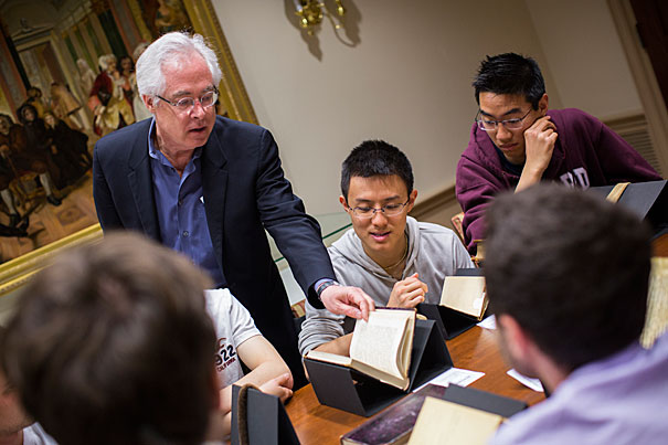 Louis Menand (left) will be awarded the National Humanities Medal by President Obama. He is pictured with Bowen Lu ’17 examining a volume of “The Brothers Karamazov” by Dostoyevsky from 1881.