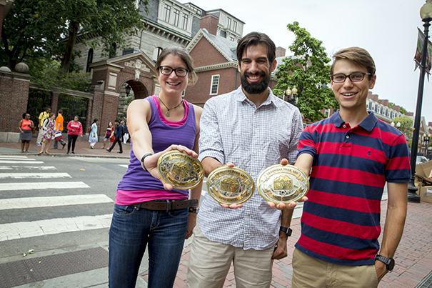 Harvard University students and training partners Maartje Bastings (left), Charles Hornbaker, and Max Darnell present their gold belt buckles for finishing the Leadville 100 Trail Run in Colorado in under 25 hours.