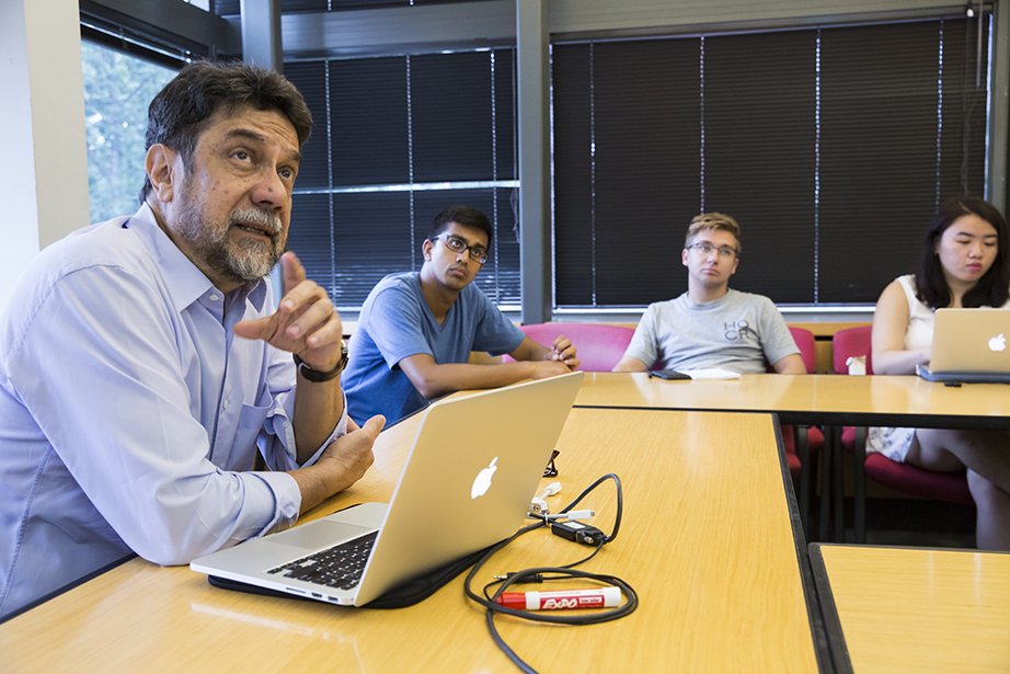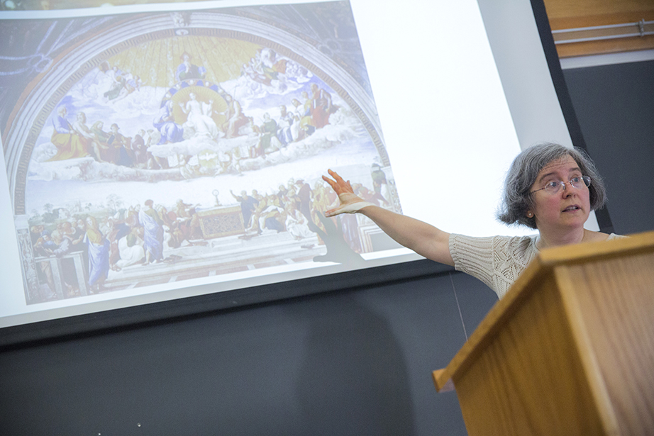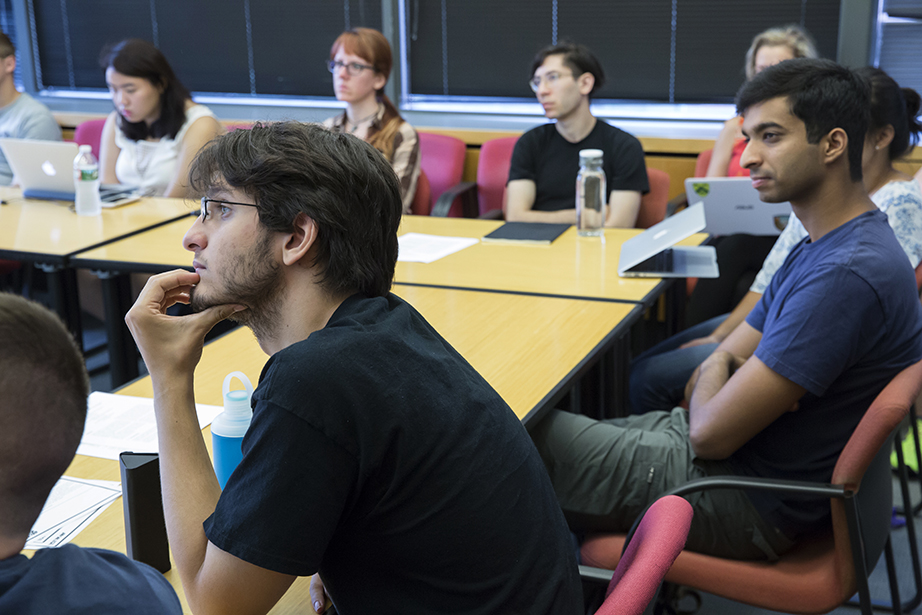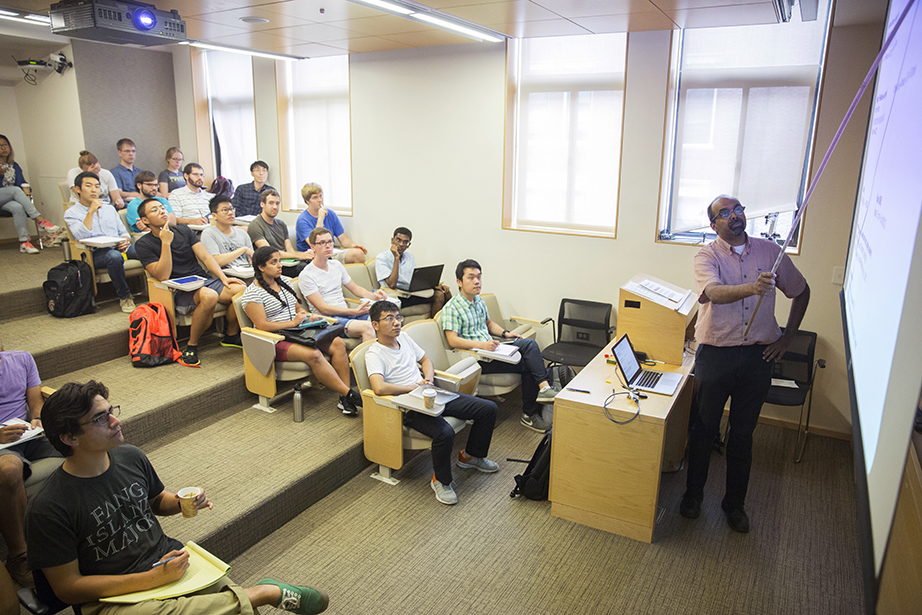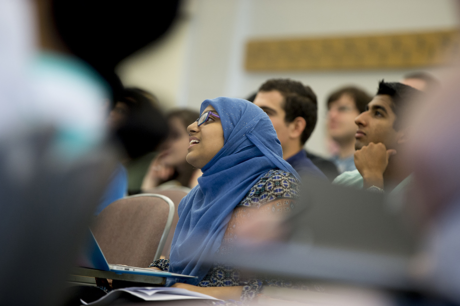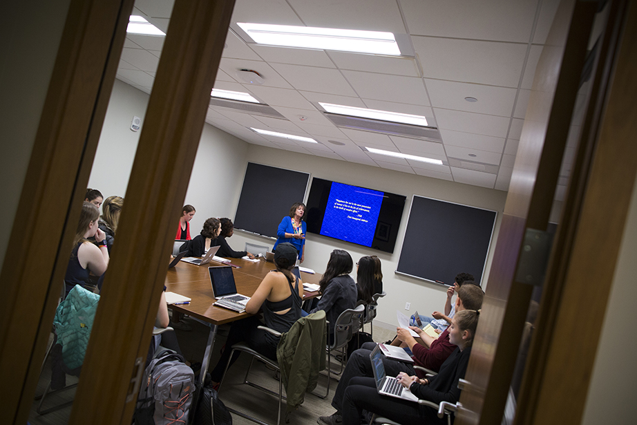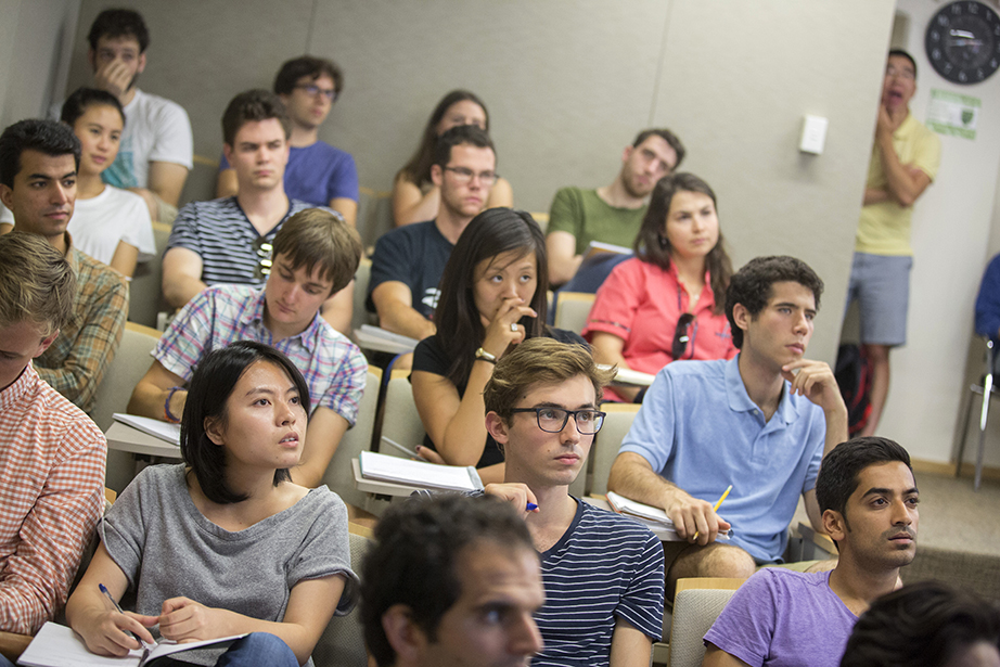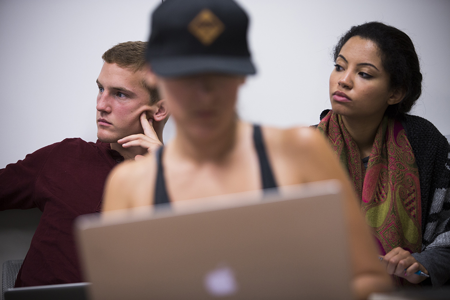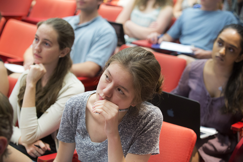 Friends since freshman year, Emily Jones (left) and Abigail Orlando finally have a class together. They head into Maxwell Dworkin during shopping week at Harvard. Rose Lincoln/Harvard Staff Photographer Yasmine Meroz teaches “Series Expansions and Complex Analysis,” a class that introduces fundamental concepts for solving real-world problems and emphasizes their applications through examples from the physical and social sciences. Rose Lincoln/Harvard Staff Photographer Jing Leung ’18 (left) and Regan Kology ’18 take “Series Expansions and Complex Analysis.” Rose Lincoln/Harvard Staff Photographer Angela S. Allan, lecturer on history and literature, teaches “American Economic Fictions.” The course considers the culture of American capitalism through an examination of a range of literary and historical texts. Jon Chase/Harvard Staff Photographer Students watch a clip from “The Lego Movie” during “American Economic Fictions.” Jon Chase/Harvard Staff Photographer Students gather in the dance studio to take “Contemporary Dance: Countertechnique” from Joy Davis (center), a certified Countertechnique expert, dancer, choreographer and educator. Stephanie Mitchell/Harvard Staff Photographer Students including Sophie Carroll ’17 (right) participate in Joy Davis’ class “Contemporary Dance: Countertechnique.” Stephanie Mitchell/Harvard Staff Photographer Tajrean Rahman ’20, Varoun Gulati ’19, and other students participate in Daniel Donoghue’s class “The History of the English Language.” Rose Lincoln/Harvard Staff Photographer Virgilio Almeida, the CAPES distinguished visiting professor, teaches “The Internet: Governance and Power.” The course covers cyberspace governance. Jon Chase/Harvard Staff Photographer Alan Bidart ’18 (left) listens intently during Virgilio Almeida’s class “The Internet: Governance and Power.” Jon Chase/Harvard Staff Photographer Jacob Olupona, professor of African and African American studies and professor of African religious traditions, teaches “Introduction to African Studies.” The course introduces students to the general outlines of African archaeology, history, and geography, as well as key concepts in the study of African health, social life, economic situation, arts, and politics. Jon Chase/Harvard Staff Photographer During “Silkscreen,” Annette Lemieux (from far left to right) and teaching fellow Amelia Spinney teach Yao Li ’18 inside the Carpenter Center. The course teaches the manipulation of found and original imagery, and monotypes on paper and other surfaces utilizing the silkscreen process. Through slide presentations, the class is introduced to the work of artists such as Bob Rauschenberg and Andy Warhol, as well as others who use the silkscreen process. Kris Snibbe/Harvard Staff Photographer Teaching fellow Amelia Spinney (standing) operates the slideshow in Annette Lemieux’s (center) “Silkscreen” class. Kris Snibbe/Harvard Staff Photographer Ann Blair, Carl H. Pforzheimer University Professor, discusses religion and Raphael’s “Disputation of the Sacrament” during “Reason and Faith in the West” in Emerson Hall. This course uses a historical perspective to examine one of the central themes in the Western intellectual tradition: the desire to reconcile rational philosophy with religious and biblical authority. Kris Snibbe/Harvard Staff Photographer L. Mahadevan teaches “Fluid Dynamics” in the Cruft Building. The course explores continuum mechanics; conservation of mass and momentum; energy, stress, kinematics, and constitutive equations; vector and tensor calculus; and dimensional analysis and scaling. Kris Snibbe/Harvard Staff Photographer Graduate School of Arts and Sciences students Tina Huang (from left) and Paul Le Floch, and Yashraj Narang, a teaching fellow in the Harvard John A. Paulson School of Engineering and Applied Sciences, listen as L. Mahadevan explains the connection between Jackson Pollock’s paintings and the field of fluid dynamics. Kris Snibbe/Harvard Staff Photographer Shelley Carson teaches “Creativity: Madmen, Geniuses, and Harvard Students.” Stephanie Mitchell/Harvard Staff Photographer Students including Andrew Roney ’17 (left) and Veronica Kane ’18 (right) gather in a William James Hall seminar room to hear Shelley Carson teach. Stephanie Mitchell/Harvard Staff Photographer During “Foundations of Biological Diversity” inside the Science Center, biology professor Brian Farrell, director of the David Rockefeller Center for Latin American Studies, teaches an integrated approach to the diversity of life, emphasizing how chemical, physical, genetic, ecological, and geologic processes contribute to the origin and maintenance of biological diversity. Kris Snibbe/Harvard Staff Photographer Jenny Walsh ’17 (center) listens during “Foundations of Biological Diversity,” taught by Brian Farrell, director of the David Rockefeller Center for Latin American Studies. Kris Snibbe/Harvard Staff Photographer Students file into Harvard Hall for classes during “shopping period” at Harvard University. Rose Lincoln/Harvard Staff Photographer