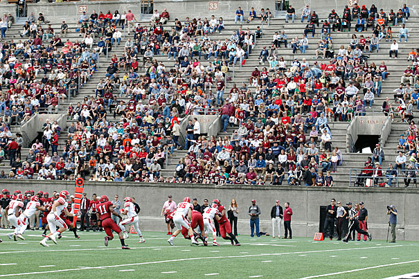 A crowd of local residents and Harvard football fans watch as the Crimson takes on the Cornell Big Red.