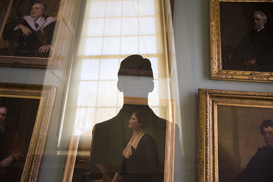 The underbelly of Harvard Stadium forms a kaleidoscope, an abstraction of steps and stairs. A solitary runner gazes across Harvard Stadium as he climbs and descends the steps. Johnston Gate, the first, largest, and most lavishly constructed entrance to Harvard Yard, arches over the Littauer Building. The River Houses, punctuated by the Eliot House Tower, ripple along the Charles. Charles Eliot’s sycamore trees, which have lined the Charles River since 1897, enhance the Weeks Footbridge. The tower of Memorial Church adorns its own entrance. The church, built in 1932, was dedicated on Armistice Day to honor the men and women of Harvard who died in WWI. Fallen oak leaves overlay the shadows and bricks along Houghton Library. Emily Koch ’20 merges with her own painting crafted for her Visual and Environmental Studies class, VES 24, taught by Matt Saunders in the Carpenter Center. Ornate gilding enhances pages of the Gutenberg Bible on display in the Harry Elkins Widener Memorial Library. Immersed in her studies, Tina Huang ’18 prepares for a final examination in mathematics. Students tread the paths of Harvard Yard to classrooms atop the Memorial Hall tower. Portraits and sculptures of historic Harvard leaders mingle in the Faculty Room of University Hall. LeBaron Russell Briggs, who served as dean of Harvard College and president of Radcliffe, is eclipsed in the light of the window, while Cecilia Payne-Gaposchkin, Phillips Professor of Astronomy, is caught in a contemplative gaze at the night sky. With more than 50 miles of shelves and more than 3 million volumes, the stacks of Widener Library are brimming with books. Maple leaves colored in crimson flow through the John Harvard Statue. Scholars enter gateways to the Yard in the spirit of the inscription under the bust of James Walker, past president and overseers of Harvard College: “Learn where is wisdom, where is strength, where is understanding; that thou mayest know also where is length of days, and life, where is the light of the eyes and peace.”