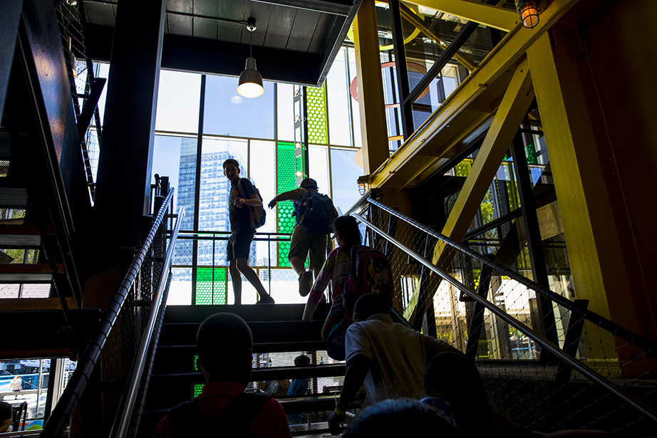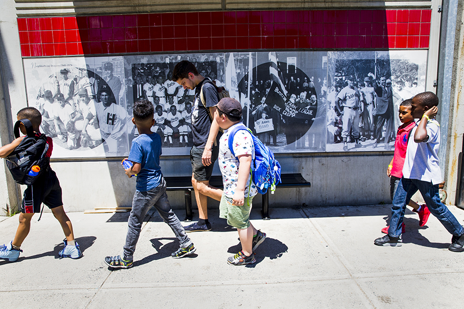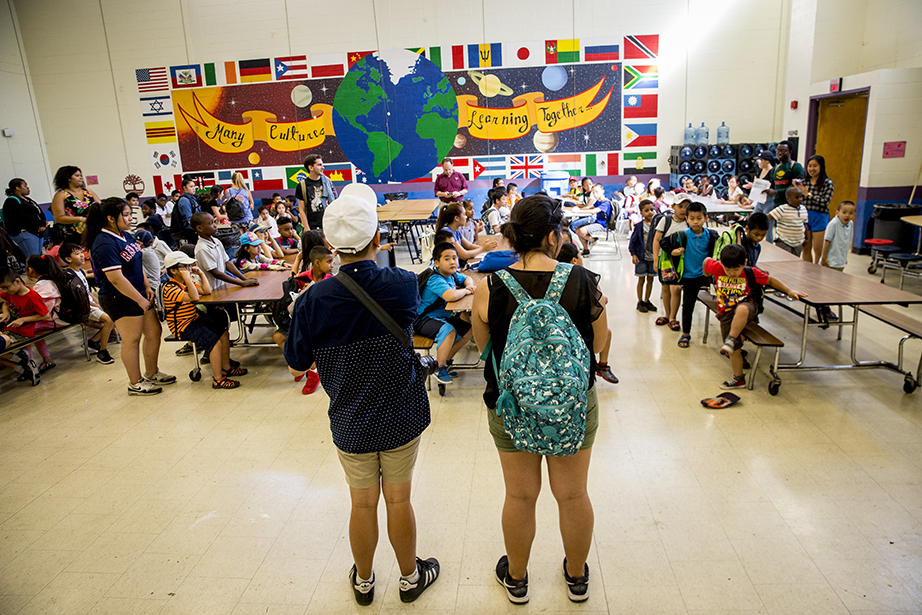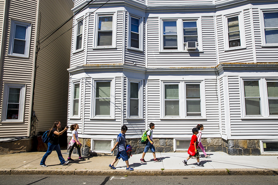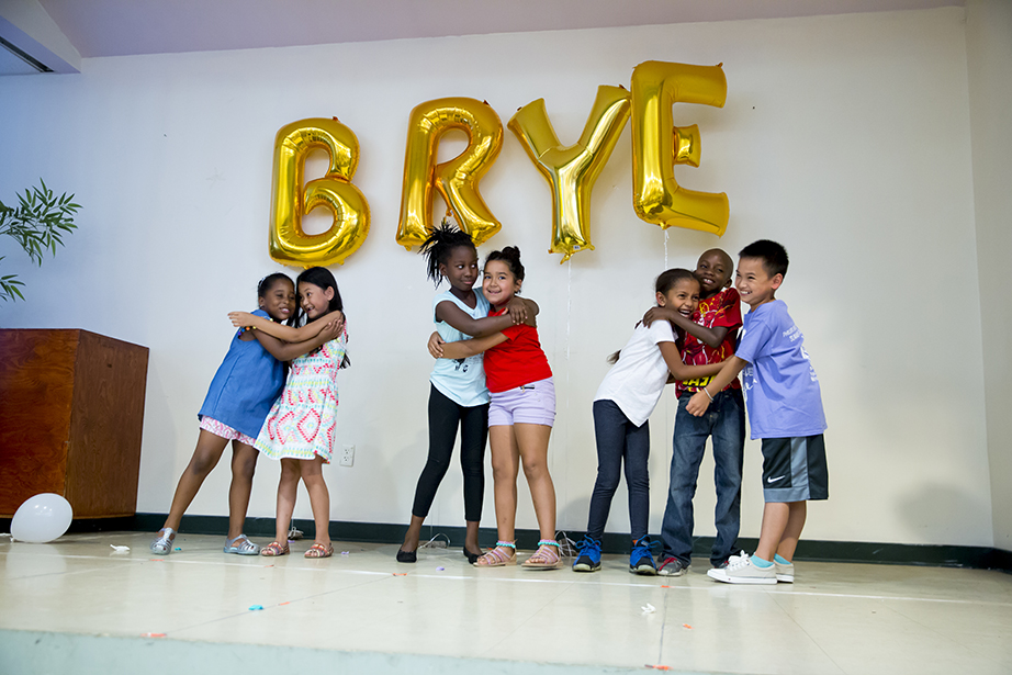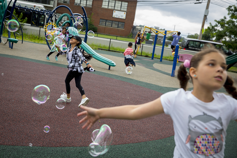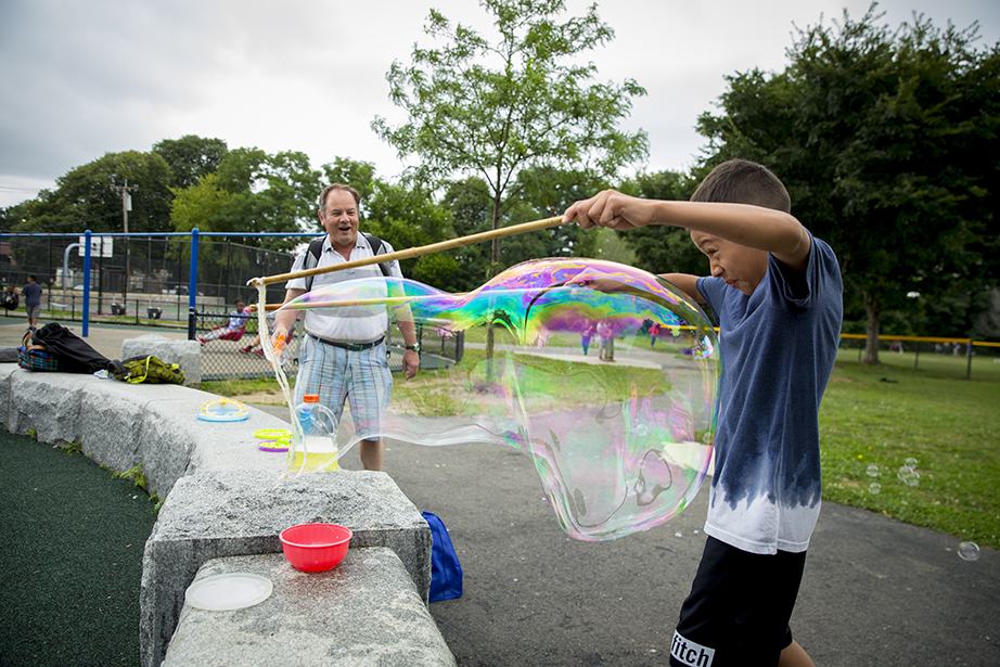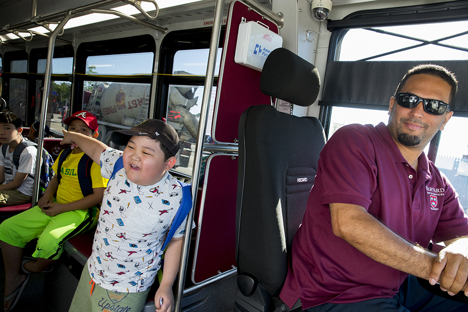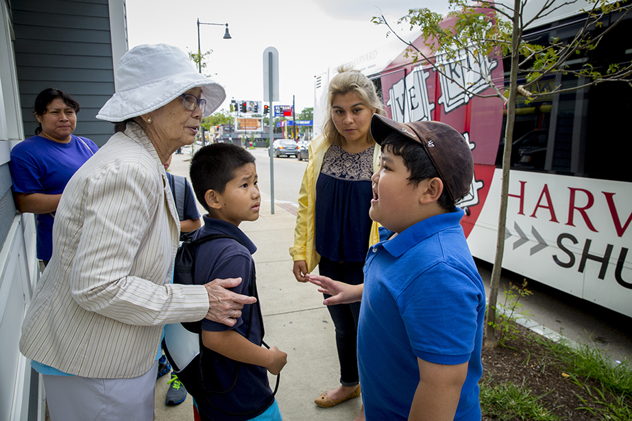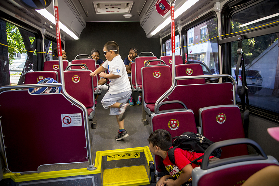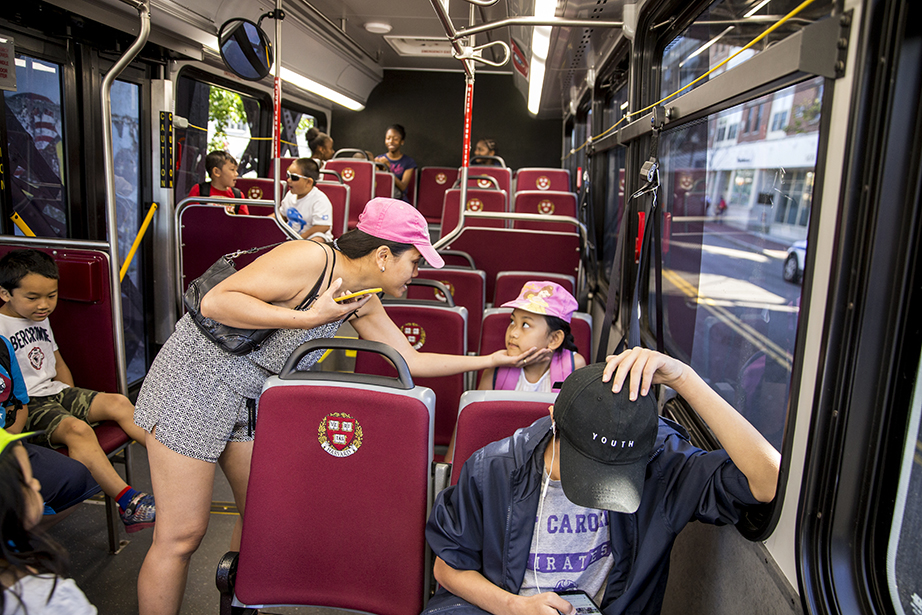 A mother packs off her daughter to the Murphy School in Dorchester for the first day of camp. Kevin Nguyen, 9, says goodbye to his mother after boarding the Harvard shuttle. Dennis Pena is at the wheel. Willy Nguyen, 6, dances in the aisle. BRYE directors Thang Diep and Aileen Navarrete, both Harvard juniors, introduce themselves to students on the first day of camp. BRYE director Sophie Eakins, a Wellesley student, greets camper Thanh Nguyen. Counselor Steven Espinoza ’20 leads a group on a field trip to the Boston Children’s Museum. Steven Espinoza counts heads inside the museum. Khang Vu (left) and Nhon Nguyen work together on an interactive exhibit. A pulley exhibit captures the attention of Shifau Oyemala (from left), Johnathan Nguyen, Jordan Nguyen, Reezahnny Veiga-Rodrigues, Ha Thanh Dang, and Austin Aguilar. Angelo Cruz (center) makes new friends while playing a game. Rebecca Hernandez ’19 guides campers back to Murphy School. Hernandez said it was on a field trip to Georges Island that she realized her group had united. “On Day 1, I didn’t think it would happen, and it did,” said the Texas native who moved to the U.S. from Mexico at age 6. She recalled that her childhood summers at camp helped her advance at school. She hopes to teach high school when she graduates from Harvard. At the bus stop, Kevin Nguyen translates information about the BRYE program for Khang Nguyen’s grandmother. Aileen Navarrete walks 8-year-old Thao Nguyen home from the bus stop. “I don’t like the outside of my house,” Thao said. “I do,” replied Navarrete. “It’s the color of my coat.” Steven Espinoza helps students decide whether to “dab” left or right for the camp’s final show. Thang Diep arm wrestles Thao Nguyen while Phat Nguyen looks on. Ifedayo Famojuro ’19 mentors Javier Mariano, 11. Jeffrey Peilco, 8, makes sure not to get wet while using a bubble kit that Kerry McGowan (left), Phillips Brooks House Association program director, made for the campers. Trinh Bui (left) and Taina Suazo, both 9, play with bubbles. Students react to photos of themselves in a gallery that Thang Diep created. Parents were invited to the final show at the Vietnamese American Community Center in Dorchester. Lia Michelle Campusano (from left), Ha Thanh Dang, Shifau Oyemala, Mia Werner, Reezahnny Veiga-Rodrigues, Johanot Pierre, and Khoa Ho perform a song and dance at the final show.