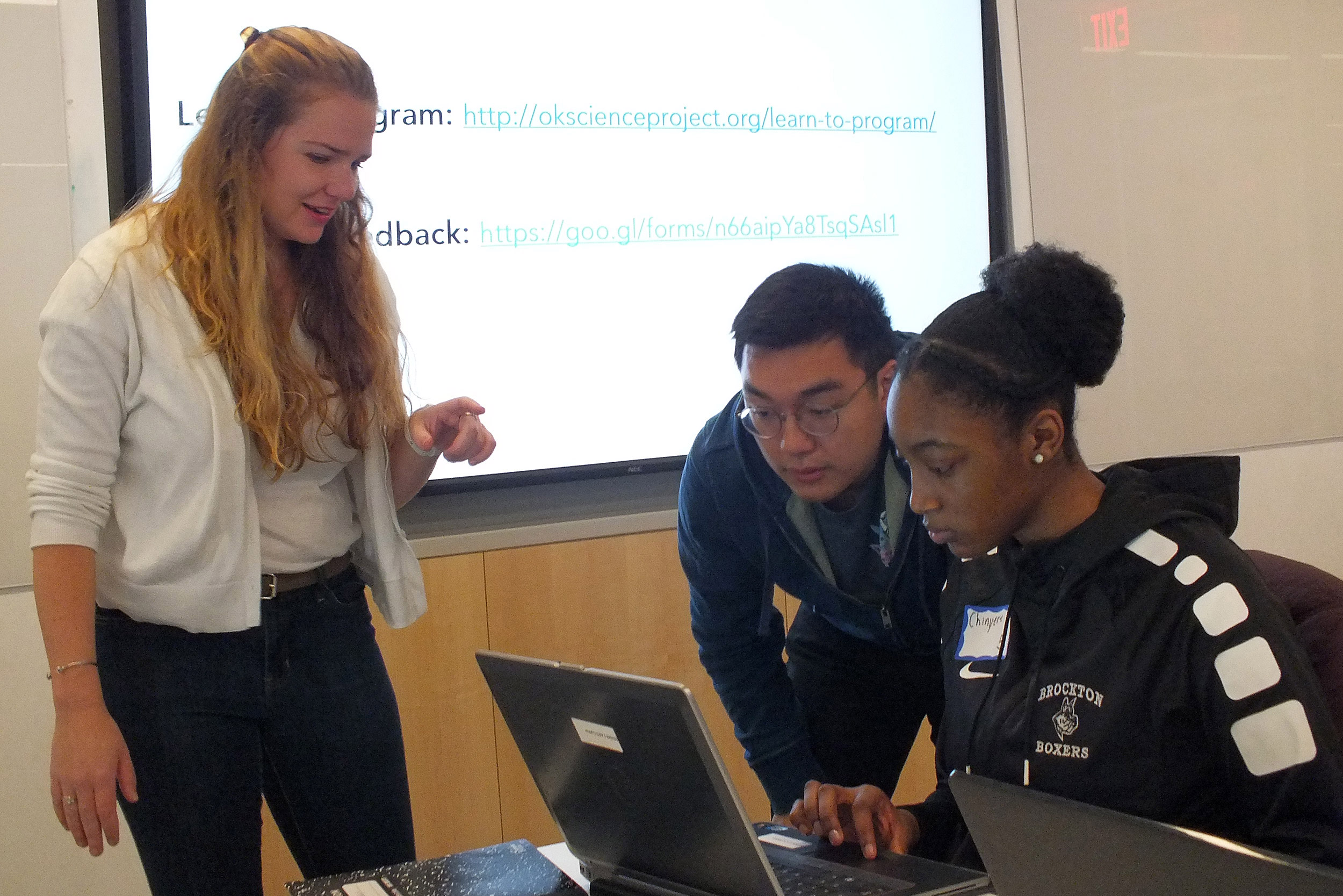 Kate LaChance leads a bioinformatics workshop with HPREP students, while Rebecca Fine works with a student to help her solve bioinformatics problems on the Oklahoma Science Project, an online resource improving accessibility and promoting STEM education in Oklahoma. Along with pilot funding, Operation Impact helped them set up meetings with venture capitalists, entrepreneur networks, and other STEM focused education platforms.