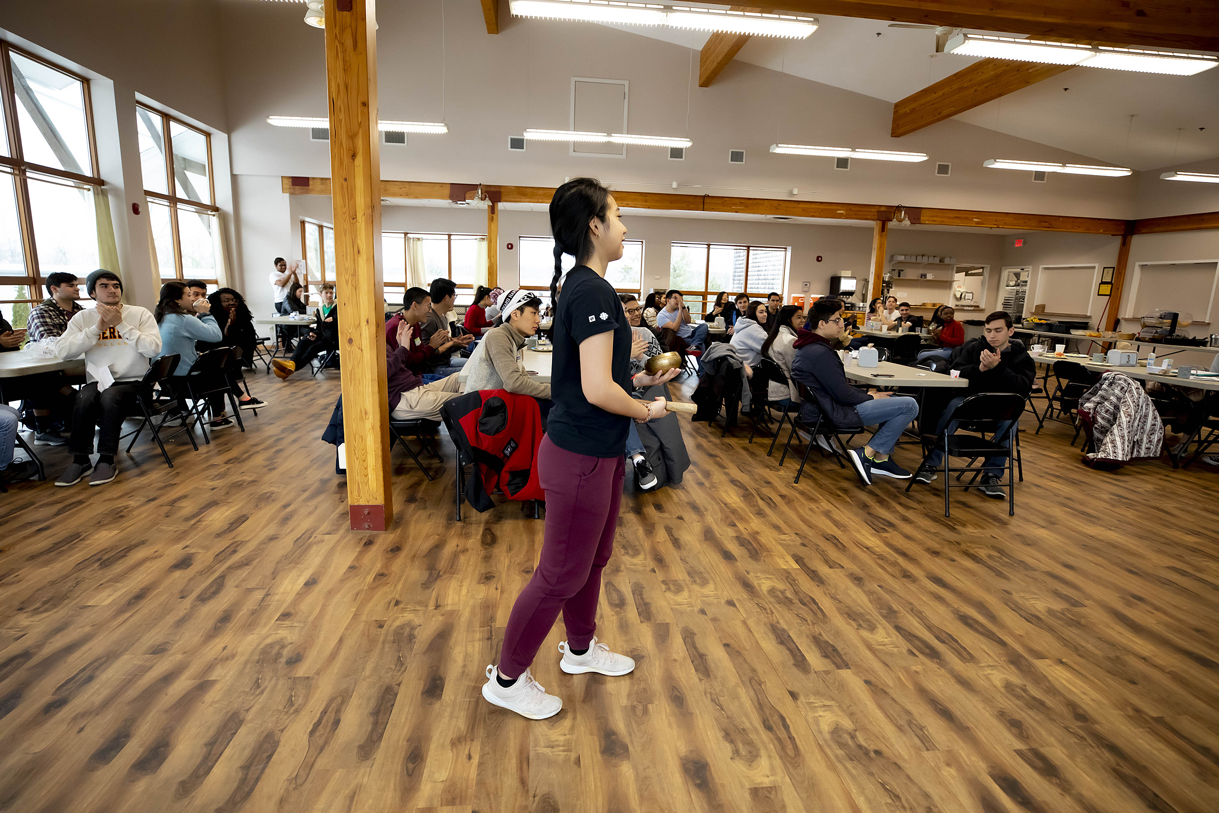 The Saturday karaoke session, which ran overtime due to enthusiasm, was one of the activities offered during the First-Year Retreat, held over three days at the Prindle Pond Conference Center in Charlton. The goal of the annual gathering is to help students regroup and reflect on personal identity and core values through guided sessions with older students, coupled with various options for activities, mindfulness and wellness training, and relaxation.