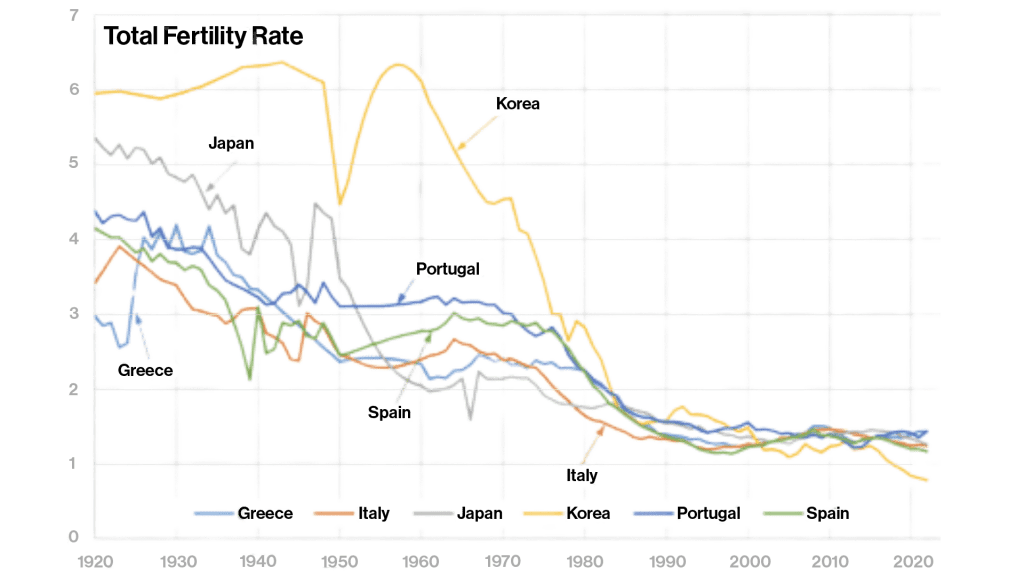 The second group — Greece, Italy, Japan, Korea, Portugal, and Spain — developed quickly from the mid-1950s and ’60s after long periods of economic stagnation or decline. Each averaged three children or more per woman in 1970. But all six had dropped below two by the mid-1980s. Most had converged to around 1.3 by the mid-1990s, with Korea being the extreme case. Its total fertility rate for 2022 (the last year included in Goldin’s analysis) was 0.78 children per woman.