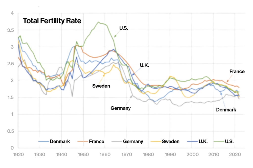 Her paper compares fertility rates in two groups of six countries. The first set — comprised of Denmark, France, Germany, Sweden, the U.K., and the U.S. — saw relatively continuous economic development over the 20th century even with the disruptions of the Great Depression and two world wars. All had reached a total fertility rate of around two children per woman by the 1970s. Not until the 2010s did rates fall below that figure.