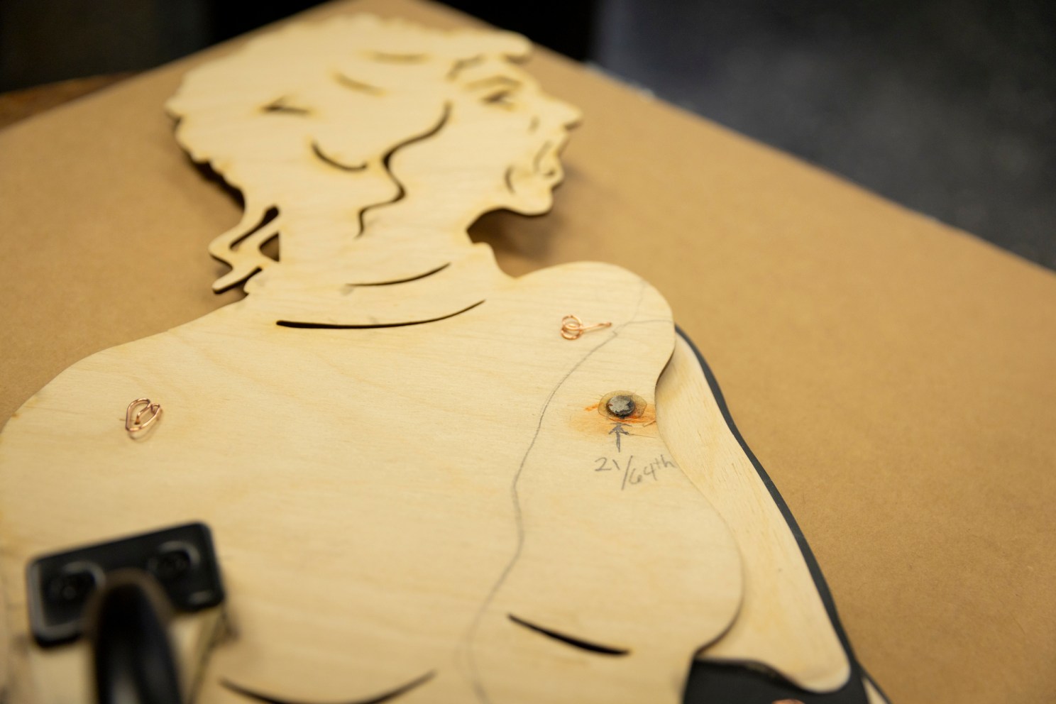 Brehm worked with Nolen to design and build the puppets. About a foot in length, the handheld shadow puppets are made from a combination of thin plywood, styrene, and acrylic, and some have movable joints constructed with wire.
