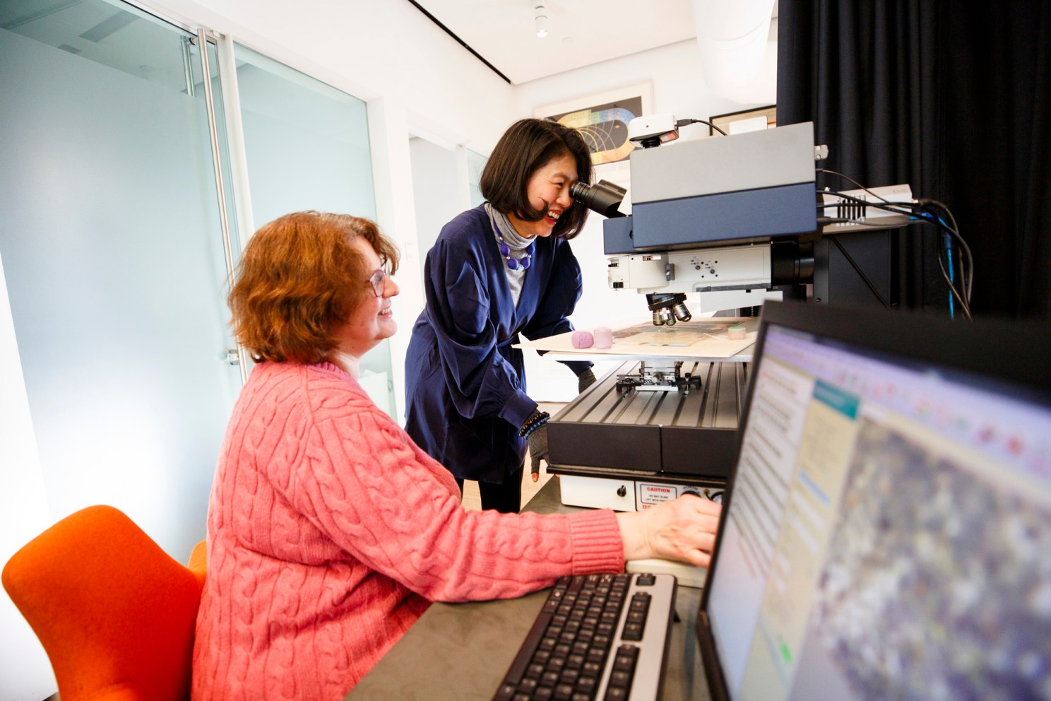 Katherine Eremin (left) and Jinah Kim observe a manuscript under a microscope.