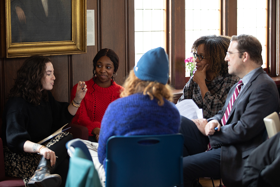 Becca Leviss (from left), Eden Olayiwole, HDS Dean Marla F. Frederick, and Professor David Holland engage in dialogue during the Judaism session of “Love Through a Multifaith Lens.”