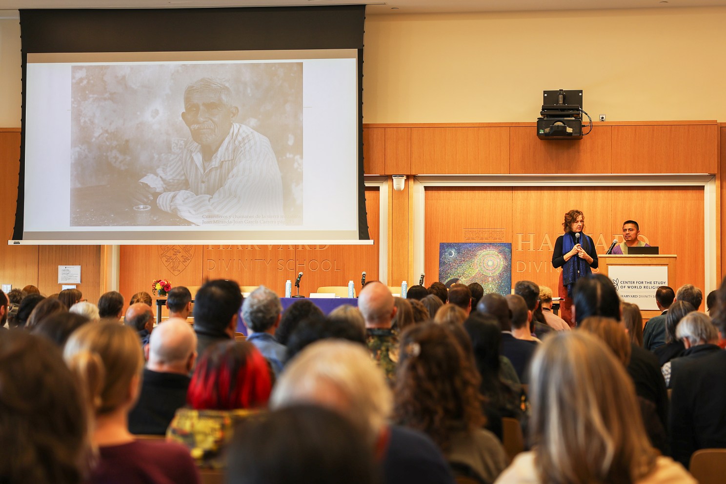 Elías García Méndez, co-founder of Casa Adobe, the first art collective in Huautla de Jiménez, Oaxaca, Mexico, speaks through interpreter Emily Getchell about the significance of community elders and healers in ritual healing using psilocybin mushrooms. Méndez was a keynote speaker at the Psychedelic Intersections 2025 Conference at Harvard Divinity School on Feb. 15.